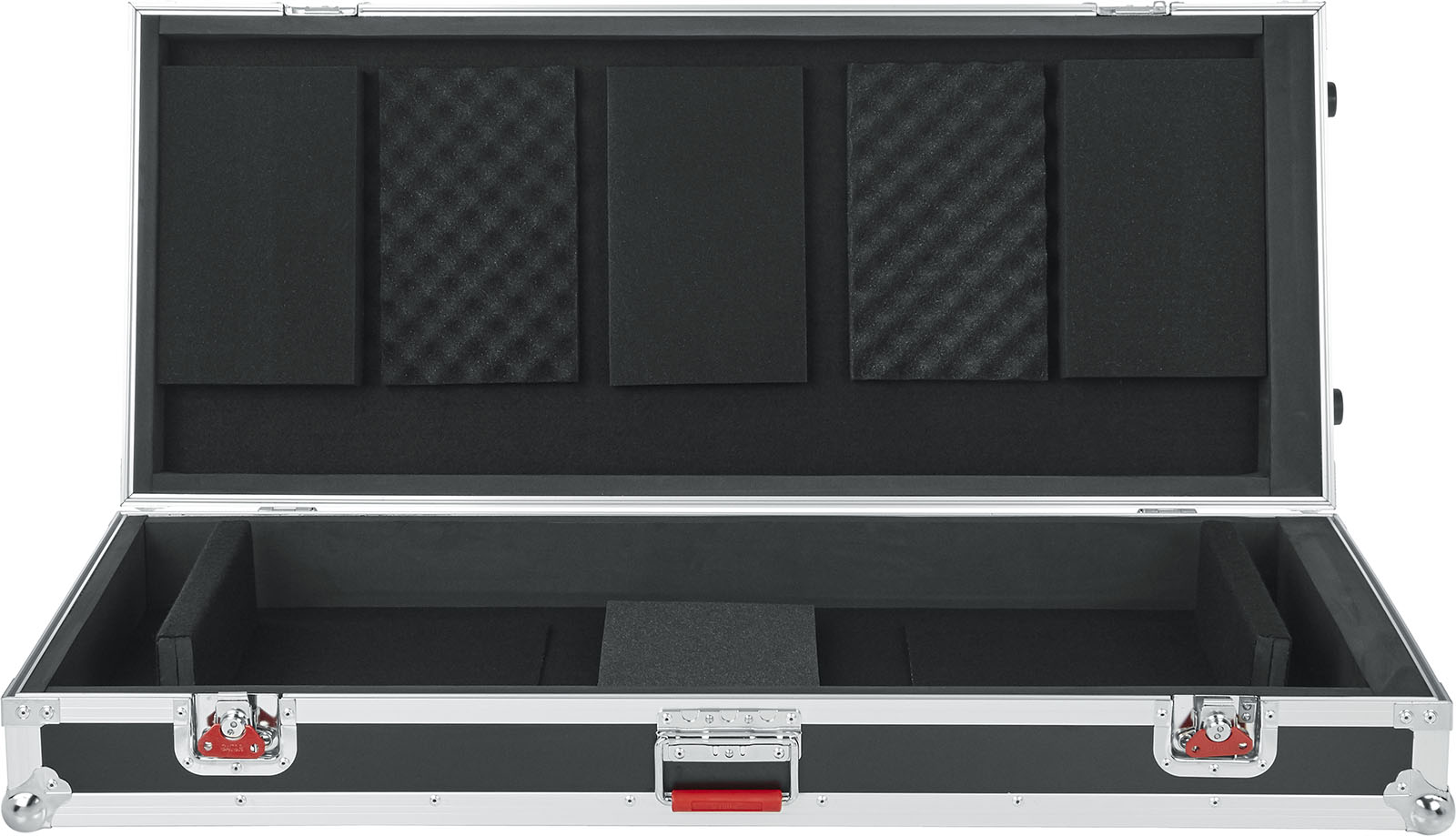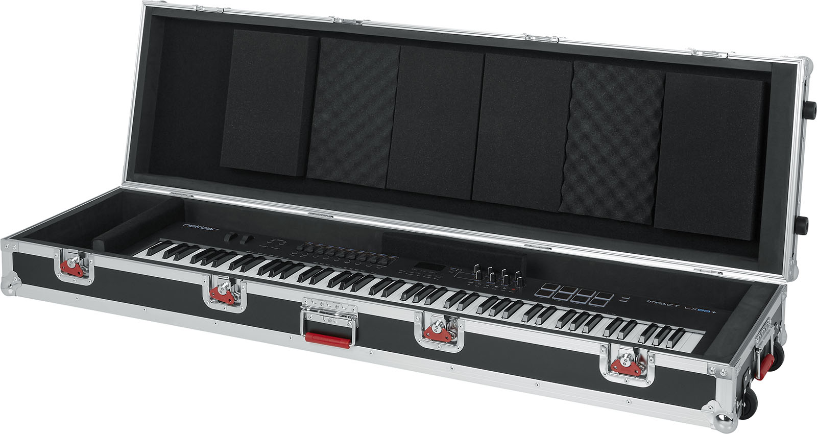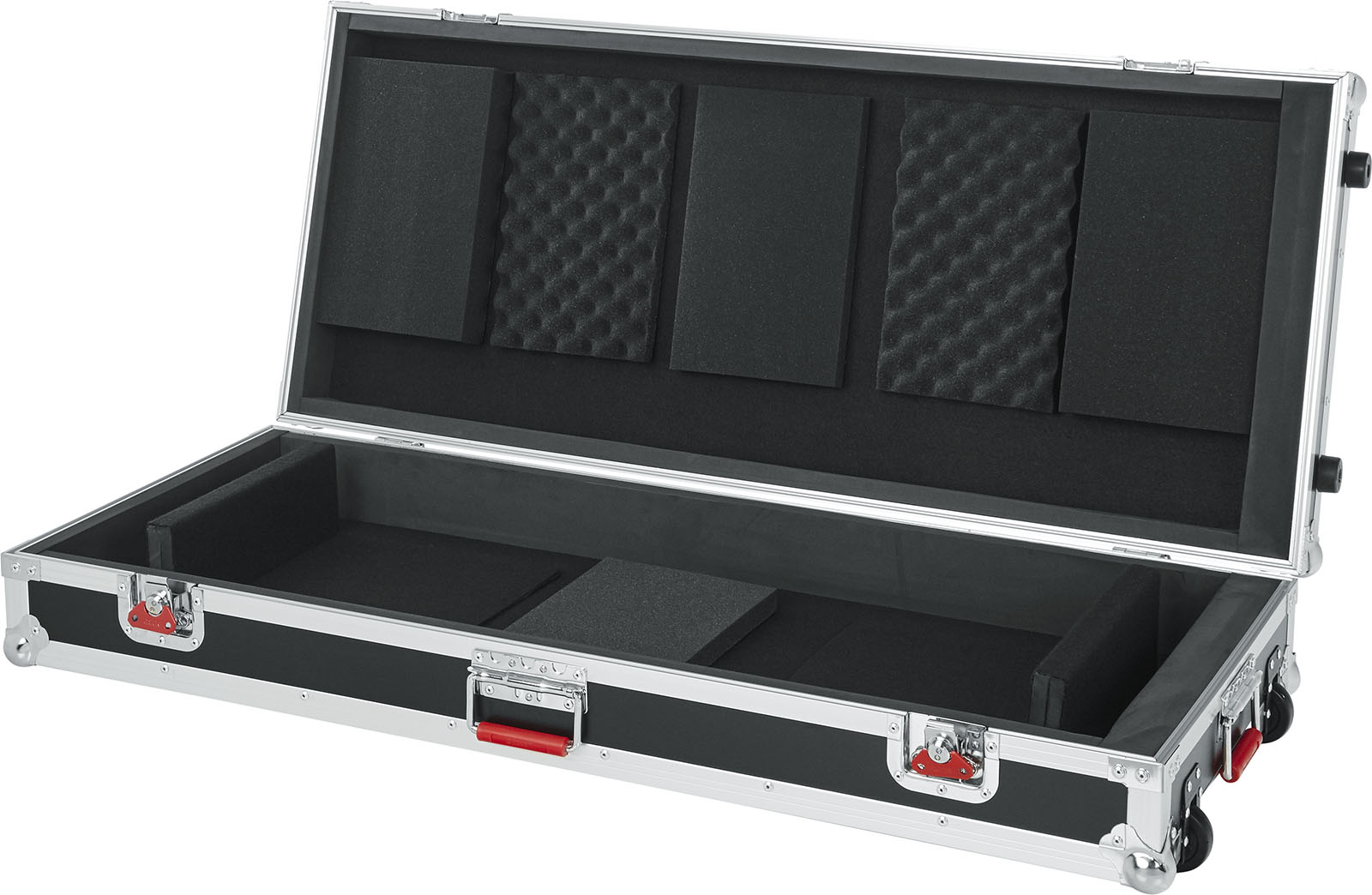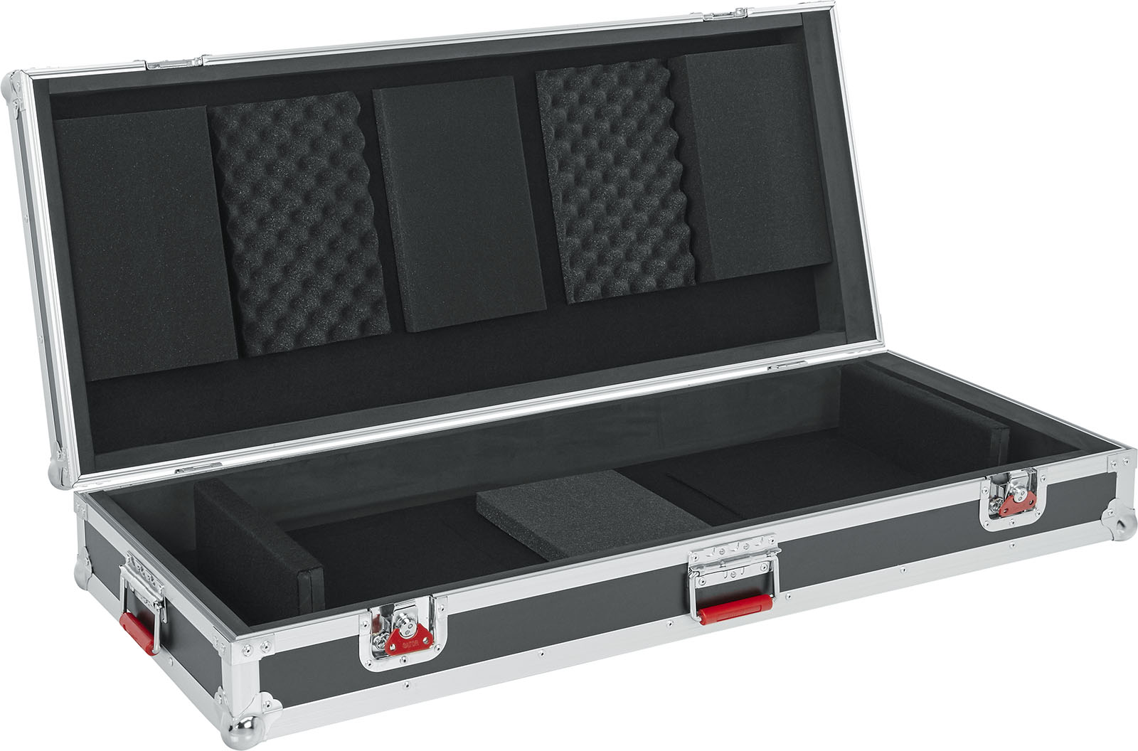 Flight case ATA Gator en bois pour claviers 88 notes, conçu pour un usage professionnel intensif. Sa structure en contreplaqué renforcé avec revêtement laminé et ses profilés aluminium à rainure et languette assurent une protection maximale lors du transport.