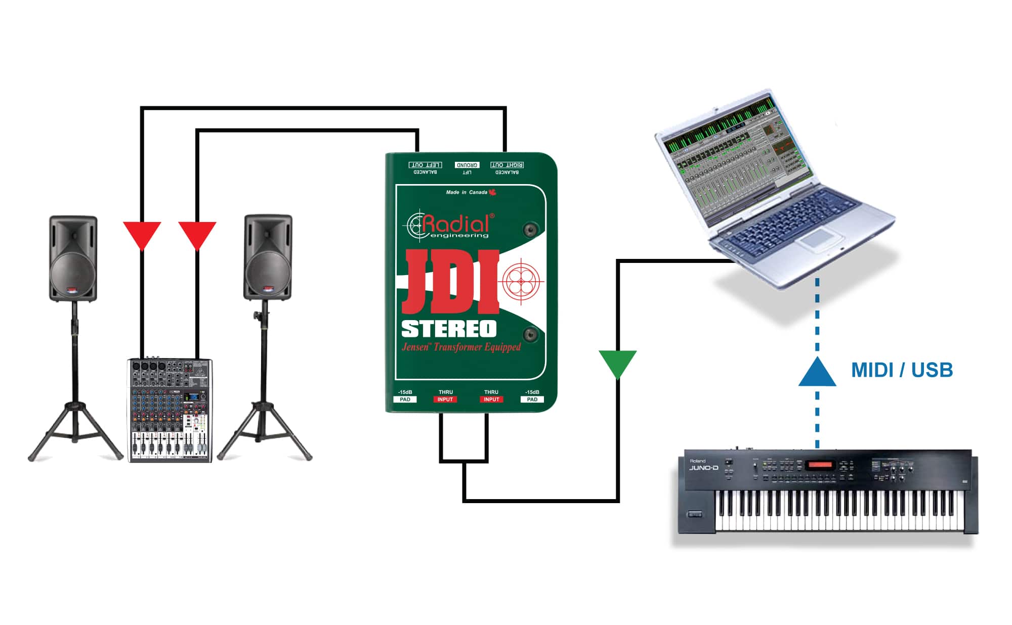 La Radial JDI Stereo est une boîte de direct passive stéréo conçue pour gérer des niveaux de signal extrêmes sans distorsion d'aucune sorte.Contrairement à une DI active - qui est limitée par la tension de rail du buffer de l'amplificateur, la Radial JDI Stereo emploie une paire de transformateurs audio Jensen qui gèrent à la fois la symétrisation du signal et réduisent l'impédance permettant de grandes longueurs de câbles. Aucune alimentation n'est donc nécessaire.La magie vient des transformateurs Jensen que l'on trouve dans le circuit. Les transfos Jensen sont reconnus pour leur capacité à gérer correctement les transitoires tout en offrant un soyeux et une douceur qui rappelle la consonance du matériel vintage.D'une réponse plate de 10 Hz à 40 kHz et avec pratiquement aucune déviation de phase, la Radial JDI Stereo délivre le son naturel et pur de l'instrument sans artefact. En plus de convertir le signal asymétrique en basse impédance, les transformateurs servent également à isoler l'entrée de la sortie en filtrant la tension continue parasite qui peut provoquer du bruit et conduire à ce qu'on appelle les boucles de masse. Cela permet à l'audio de passer tout en éliminant les problèmes.La Radial JDI Stereo dispose d'une paire de connecteurs Jack en plus un Pad d'entrée à -15 dB sur chaque canal. Le tout est complété par un switch ground lift qui déconnecte la broche 1 des 2 sortiesXLR pour réduire les hum et buzz provoqués par les boucles de masse. L'acier employé pour son boitier est extrêmement robuste. Au format 'livre' ce dernier agit avec les capots mu-métalliques des transformateurs comme une cage de Faraday pour protéger des puissants champs magnétiques tels que ceux générés par des amplificateurs. Cela garantit le transfert du signal sans bruit et sans ronflement.La JDI originale est devenue la boîte de direct passive de référence dans les tournées et les studios professionnels du monde entier. La version stéréo aura sans nul doute la même destinée.