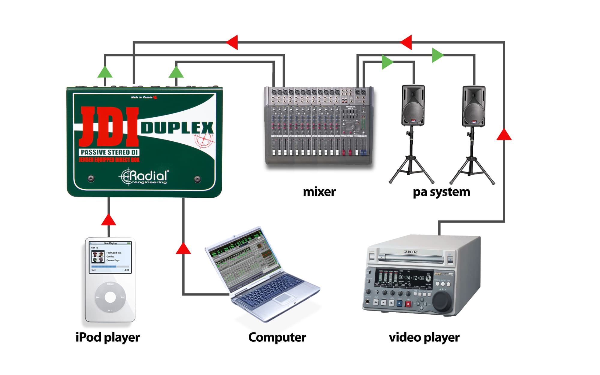 La JDI Duplex de Radial est une double DI passive conçue pour apporter le maximum de flexibilité à l'ingénieur du son dans les applications les plus exigeantes.Elle est équipée de 2 transformateurs pour un transfert du signal optimal avec un minimum de distorsion tout en produisant le son chaud qui a rendu Jensen légendaire. La JDI est parfaite pour donner un caractère analogique aux sources digitales telles que les samplers ou les claviers numériques qui ont tendance à sonner "froid".Chaque canal a 2 entrées Jack 6.35mm et RCA (parallèles) pour la connexion des sources et la sortie thru vers un appareil à haute impédance. A ceci s'ajoute une entrée XLR pour la connexion d'une source à +4dB. En façade, on trouve un switch PAD qui réduira le signal d'entrée de 15dB, un filtre coupe haut pour éliminer les bruits parasites des vieux équipements électroniques, ainsi qu'un switch Merge qui permet de sommer les 2 entrées vers 1 sortie mono.Applications :Idéale pour guitares acoustiques et bassesClaviers, batteries électroniques et modules de sonsTout instrument électronique à haut niveau de sortieElimine hums et buzzs dans les systèmes sons