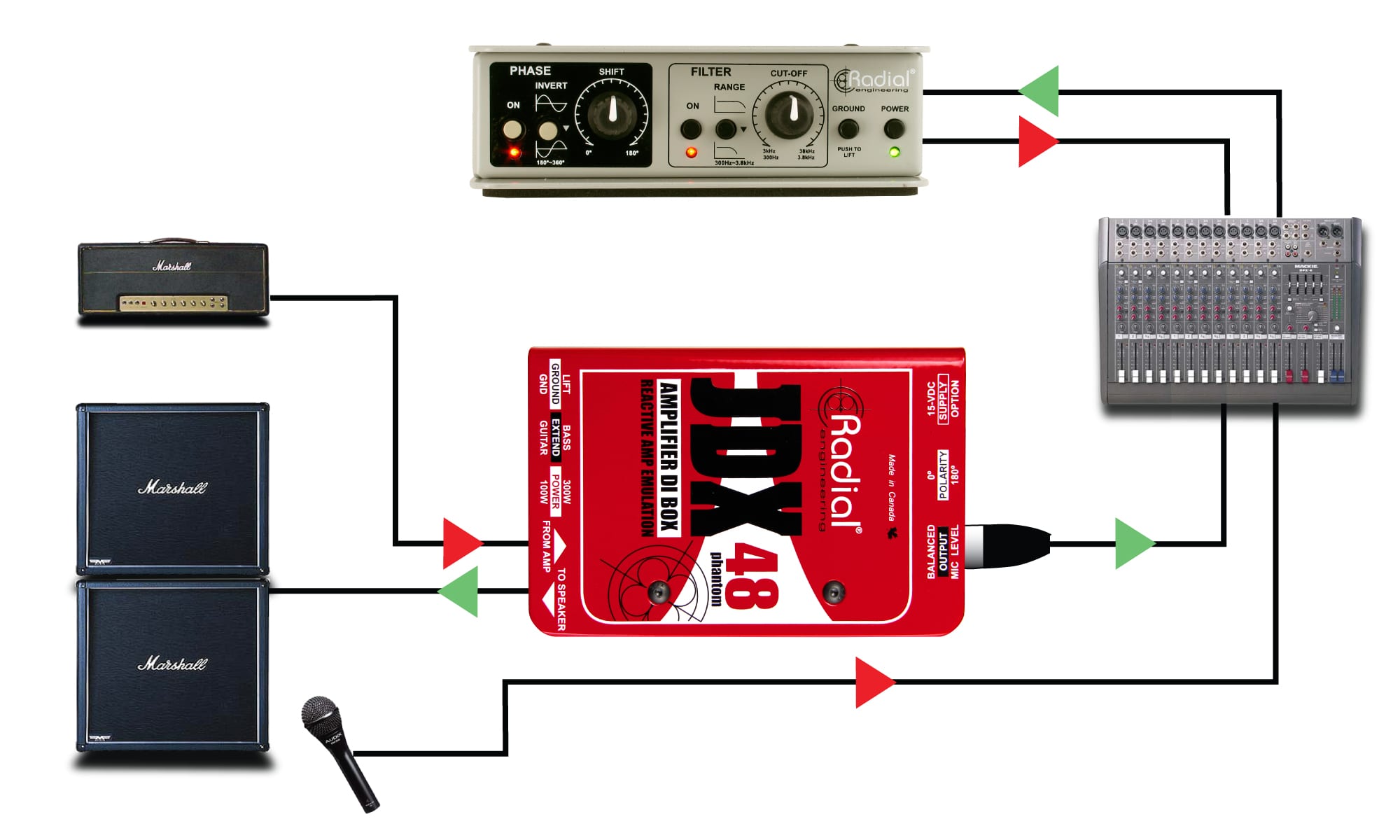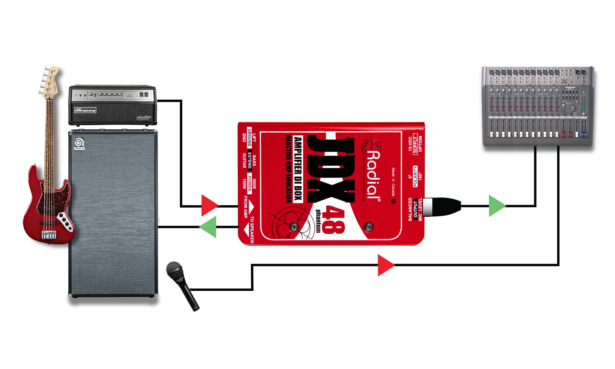 C'est une pratique bien commune pour les guitaristes que de placer un micro devant le HP pour envoyer le signal à une console de mixage, de sonorisation ou d'enregistrement.Le problème majeur est que le micro étant très près de la membrane du HP, un changement de position, même léger, entraine un changement de sonorité radicale, rendant ainsi les résultats homogènes difficiles à obtenir. L'acoustique d'une salle changeante d'une date à une autre a tendance à exacerber ce phénomène et, de plus, la repisse des autres instruments par le micro rend le mixage parfois difficile. La RadialJDX résoud ces problèmes en éliminant le besoin du microphone.A l'inverse des autres systèmes similaires qui capturent le son de la tête uniquement, la radial JDX est unique dans le sens où elle réagit à la tête ET au HP pour créer un son plus dynamique et réaliste. La JDX utilise un transformateur pour isoler l'amplificateur du système de sonorisation / enregistrement afin d'éviter les bruits parasites causés par les boucles de masse. Un filtre actif reproduit la courbe de réponse d'un HP typique de 12". La JDX utilise un circuit classe A 100% discret pour le meilleur résultat sonore possible.En éliminant le besoin d'un microphone, la Radial JDX permet d'avoir un son de guitare homogène d'un show à l'autre.LE son n'a jamais été aussi facile à obtenir !