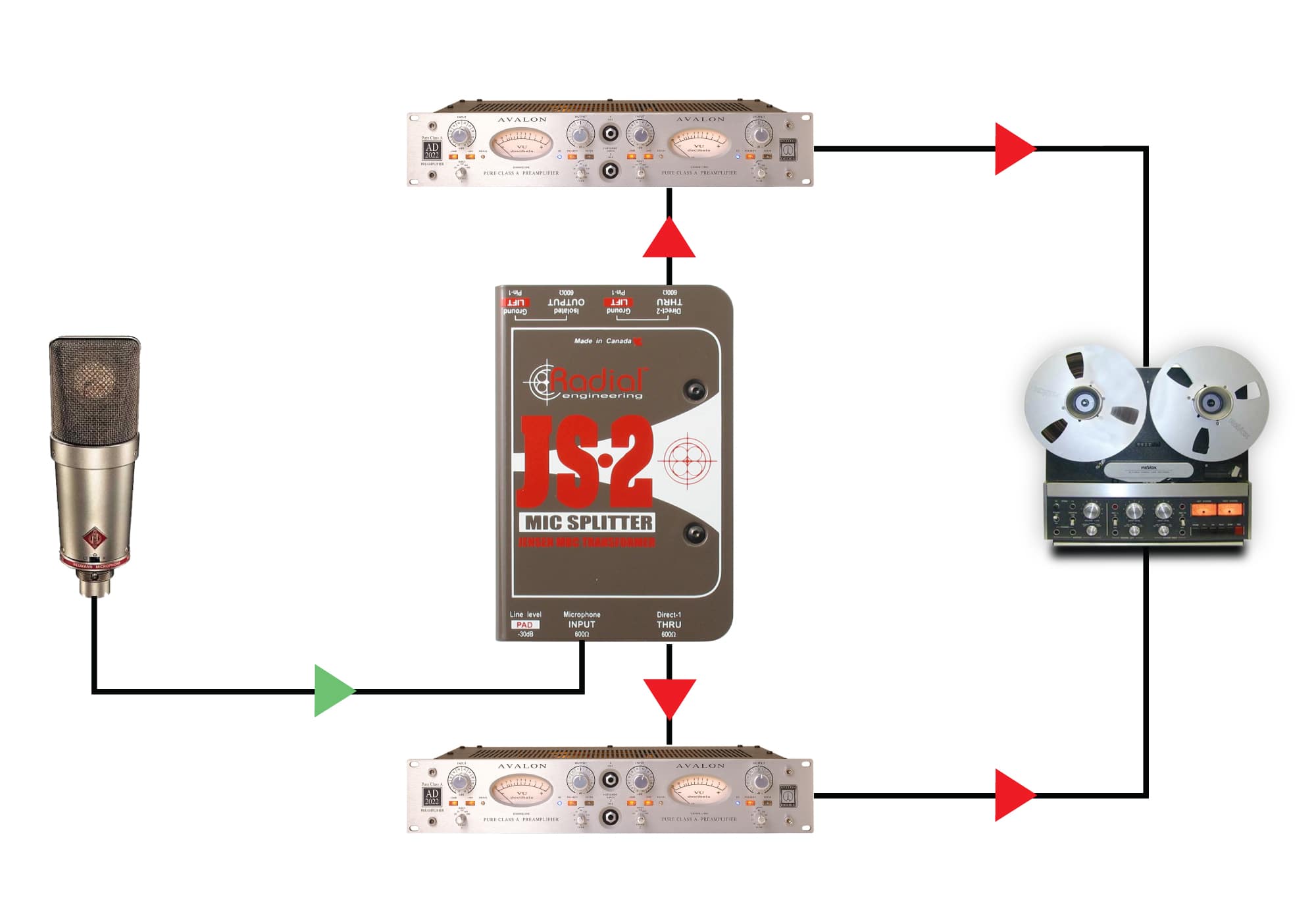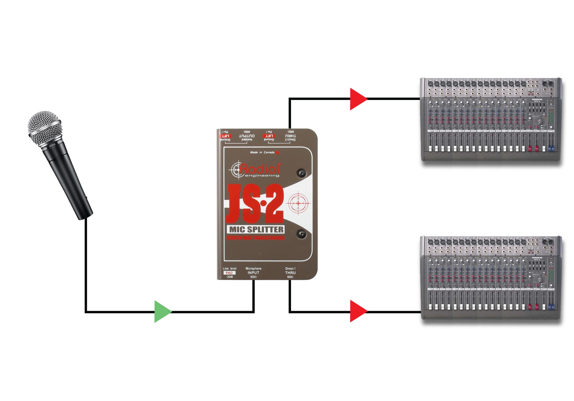 Dans certaines configurations studio ou broadcast, il est parfois nécessaire de transmettre de façon simultanée le même signal à plusieurs endroits afin d'alimenter deux consoles simultanément, ou pour comparer des préamplis micro par exemple. Le JS2, spécialement imaginé pour ce type d'application, permet de séparer un signal entrant en deux voies, via une sortie isolée et deux sorties directes. La sortie directe n°1 doit être connectée à une console afin de fournir l'alimentation fantôme qui alimentera les micros.