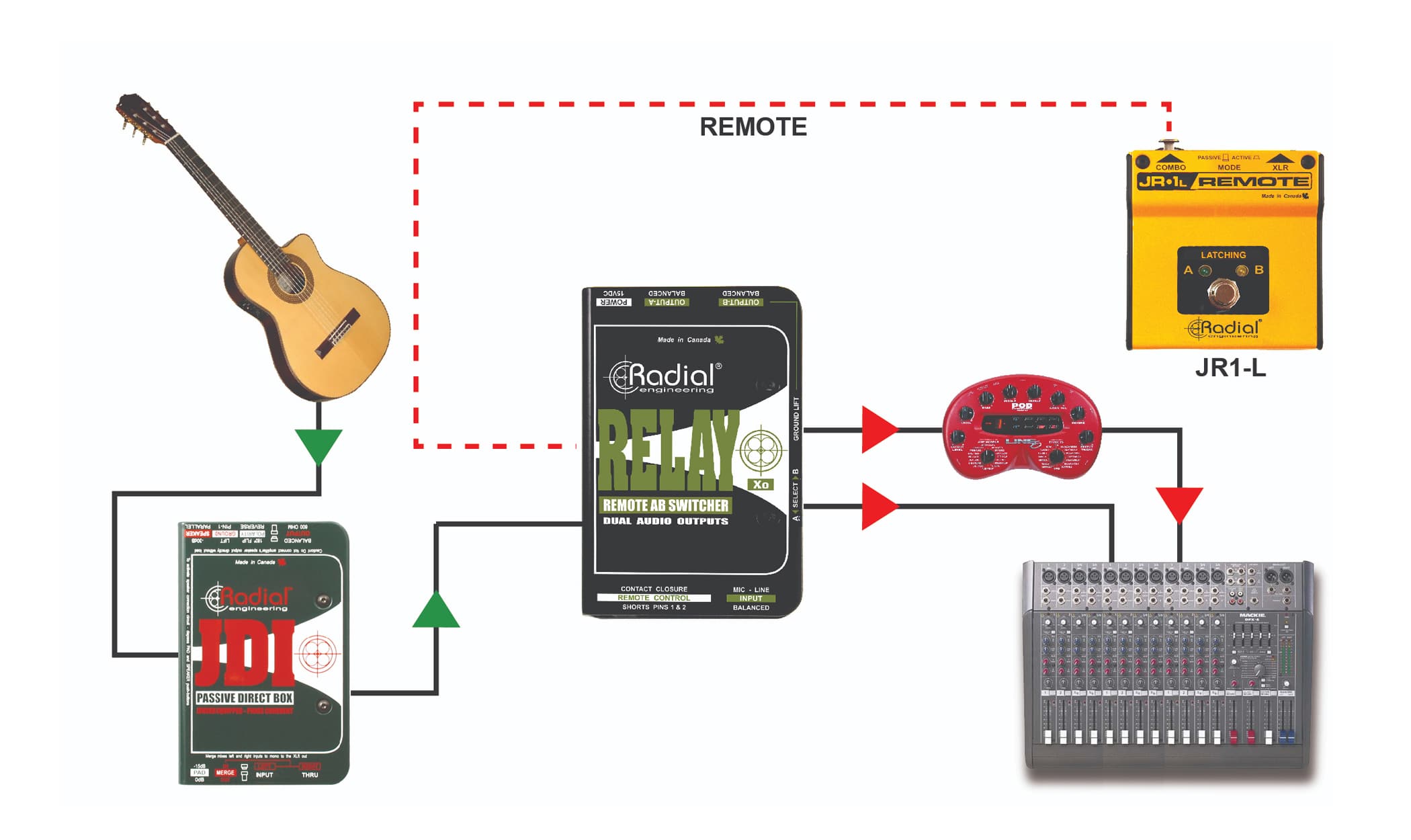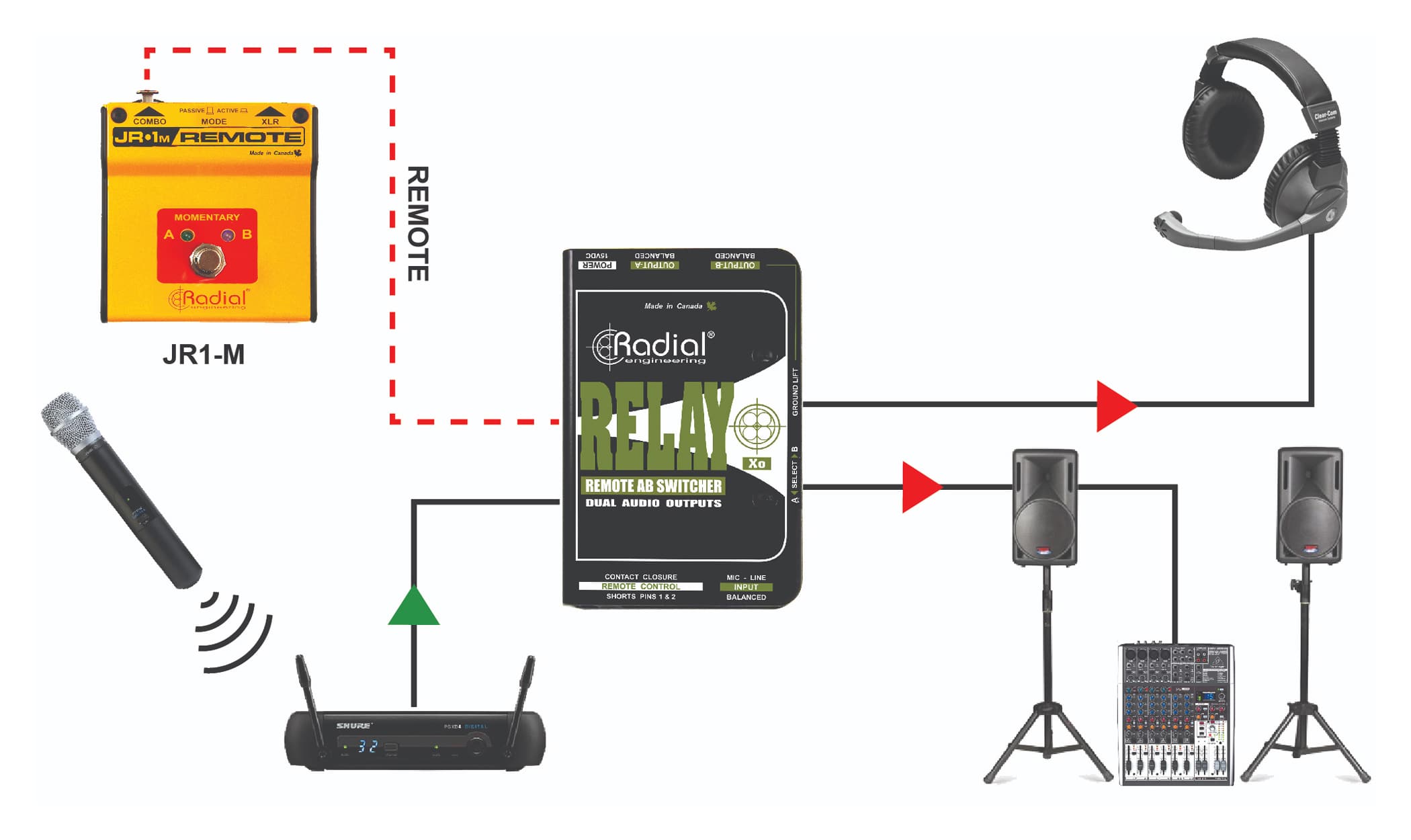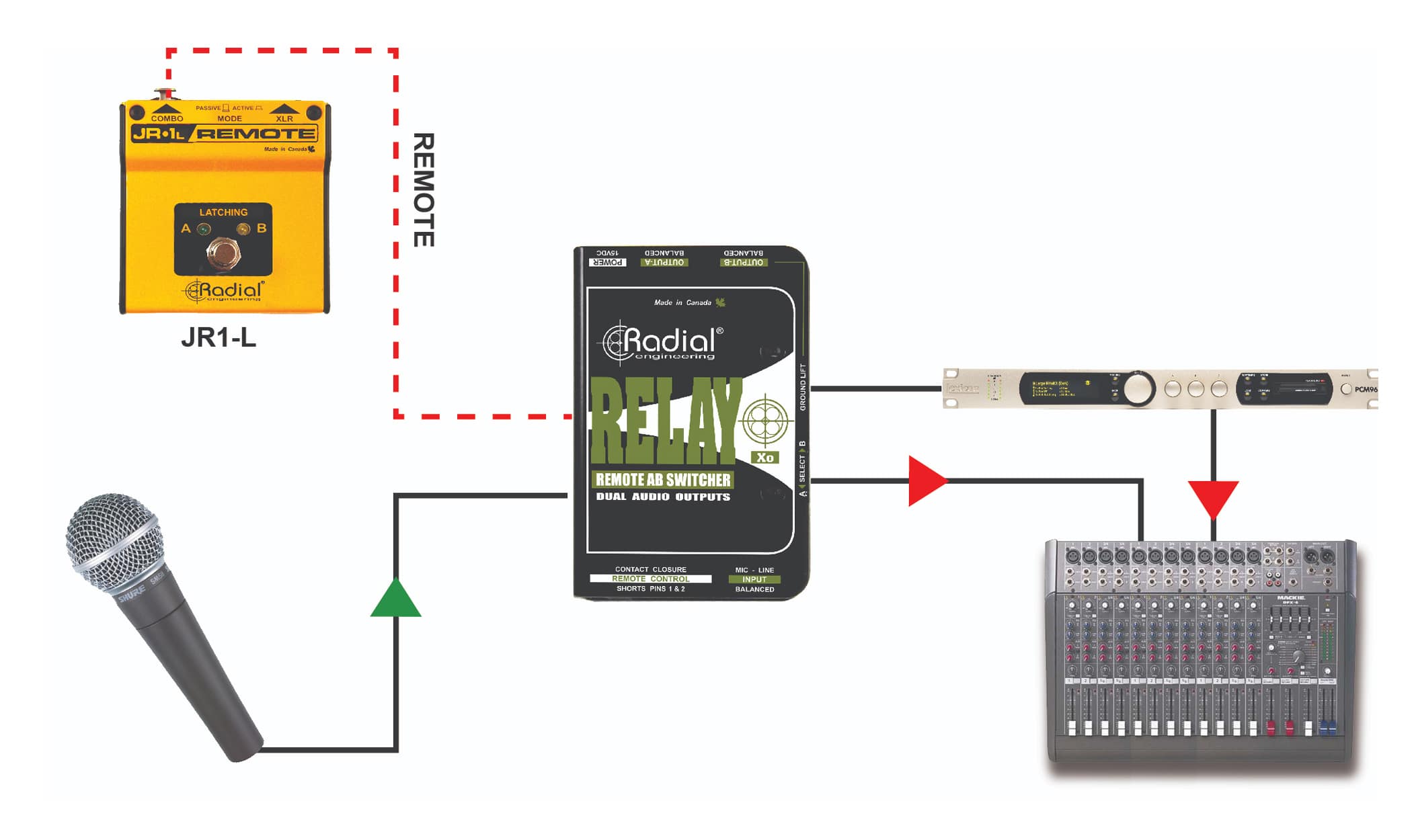Le Relay Xo de Radial est un commutateur audio puissant facile à utiliser, disposant de 1 entrée/ 2 sorties symétriques, conçu pour acheminer la sortie d'un microphone vers 2 entrées audio différenciées. Cela permet, par exemple, à un chanteur de gérer son micro pour attaquer le système de sonorisation de façade ou bien les retours de scènes afin qu'il puisse discrètement communiquer avec d'autres membres du groupe ou du personnel technique. Cela revêt une importance particulière pour les artistes qui emploient des 'ear monitors' (retours intra-auriculaires). Vous pouvez également utiliser le Relay Xo pour envoyer la sortie d'un microphone sur 2 canaux de la console de mixage en concert.Le premier canal peut être sans traitement, afin de pouvoir envoyer les morceaux au publicentre, tandis que le second canal pourrait être traité avec une réverbération et un écho afin de renforcer la voix. Cela permet à l'artiste de contrôler des effets et offrir une performance plus aboutie.Le Relay Xo dispose d'une entrée XLR symétrique et 2 sorties XLR symétriques. Le trajet du signal audio est complètement passif. Il n'y a pas de transformateur ou de buffer électronique à l'intérieur qui pourraient provoquer une distorsion ou de coloration quelconque. Au lieu de cela, le Relay Xo emploie des relais de qualité militaire avec des contacts en or pour effectuer la commutation. Le Relay Xo convient aussi bien pour les signaux au niveau micro ou ligne.La commutation peut être effectuée en utilisant l'interrupteur situé sur le côté du boitier ou par commande à distance via les connecteurs XLR combo et jack 6,35mm en utilisant soit la pédale RadialJR1-L (à verrouillage) ou JR1-M (momentanée). Un 'link' permet à de multiples Relay Xo d'être utilisés simultanément.