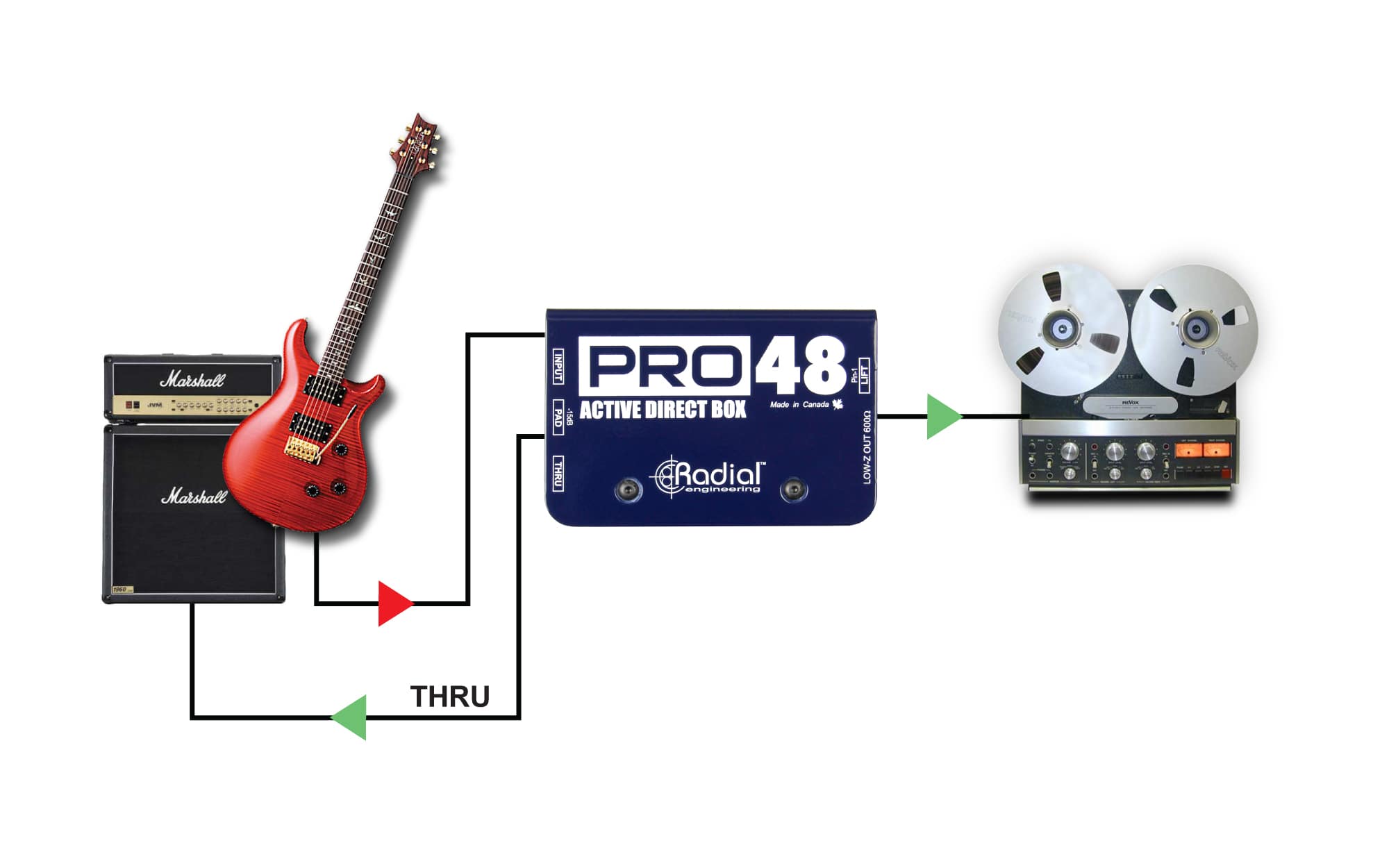 Le réamping a été l'arme secrète de nombreux enregistrements reconnus dans le milieu de la musique et est souvent utilisé sur les guitares, la basse, les claviers, les percussions et même sur les voix pour créer de nouvelles textures sonores.Le Radial Pro RMP est un ré-amper 100% passif qui permet de ré-amplifier une piste déjà enregistrée à travers un ampli ou un set de pédales.Le Pro RMP est plug'n play et facile à utiliser, connectez simplement le Pro RMP entre votre enregistreur et votre ampli et ajustez le niveau de volume. Le transformateur Radial custom s'occupe de la conversion d'impédance entre l'enregistreur et l'ampli, tout en isolant l'ampli afin de supprimer les boucles de masse engendrant des bruits parasites.Le Radial Pro RMP, un ré-amper professionnel abordable pour votre studio !Applications :+ Toutes applications de ré-amping (guitares, basse, claviers, voix, etc...)