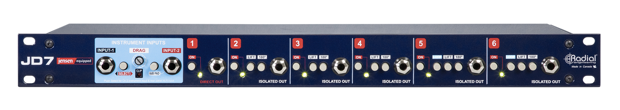 Le Radial JD7 Injector est un système de distribution de signal guitare qui permet de jouer sur 7 amplis simultanément avec la même guitare.Le JD7 est optimisé pour maintenir le son naturel de la guitare tout en éliminant les bruits parasites engendrés parles boucles de masse.Le JD7 atteint des performances sonores exceptionnelles en combinant un circuit actif 100% discret (pas d'amplis op) avec un circuit passif basé sur des transformateurs Jensen. Le son de la guitare,généralement altéré lorsqu'elle est reliée à un système actif, est conservé grâce au contrôle Drag. Ainsi, la guitare a l'impression d'être branchée directement dans un ampli, là où elle sonne le mieux !Pour l'utilisation studio, le JD7 est entièrement équipé avec des connecteurs symétriques pour le réamping. Cela permet d'enregistrer une piste guitare "dry", sans ampli ni effets, et de la rerouter une fois enregistrée dans un set d'amplis et de pédales afin de trouver le son exact recherché, une fois l'enregistrement terminé.Le JD7 de Radial est un outil hautement créatif qui permet de combiner et mixer le son de différents amplis et sets d'effets à la fois afin de créer de nouvelles sonorités.Applications :Permet de jouer sur 7 amplis différents avec 1 guitareFonctionne avec guitares, basses, claviersFonctionne aussi bien en live qu'en studio