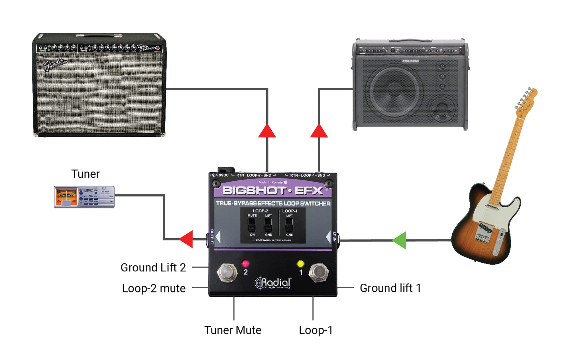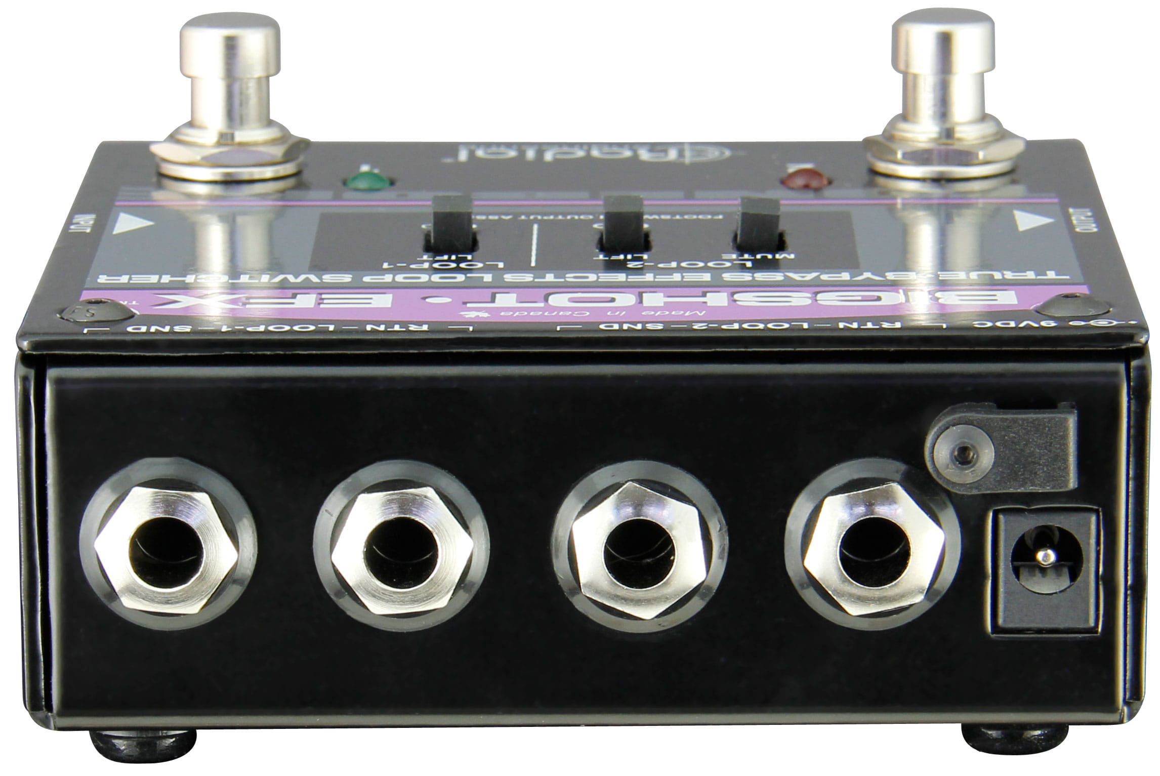 La Radial BigShot EFX est un contrôleur de boucle d'effets 100% true bypass qui vous permet de sélectionner et d'engager deux différentes configurations de pédales et de les enlever du signal lorsqu'il est inactif.Ceci est particulièrement utile quand on utilise des pédales d'effets dépourvues d'un véritable bypass qui détruisent le son de la guitare à cause du chargement ou des vieilles pédales qui rajoutent des bruits parasites dans le signal.Chaque boucle peut être utilisée séparément ou les deux peuvent être utilisées en série. Par exemple vous pouvez avoir des pédales de saturation dans la boucle 1 et des effets tel que flangers et phasers dans la boucle 2. Elles peuvent être combinées si besoin.Vous pouvez aussi pré configurer puis activer deux configurations d'effets complètement différentes.Compacte pour une utilisation sur un pédalier, la pédale avec laquelle on se branche et on joue est facile à utiliser : D'un coté il y a une entrée au format jack pour la guitare, de l'autre une sortie au format jack pour l'ampli. Entre les deux sur le dessus, il y a deux ensembles de jacks send et return pour diverses pédales.Chaque boucle d'effets est équipée d'un interrupteur ground liftpour réduire bruits parasites et ronflements produits par des boucles de masse.La boucle d'effets 2 peut aussi être positionnée sur mute pour accorder votre guitare de façon silencieuse.Conçue à partir d'acier résistant d'une épaisseur de 1.9 mm, la Bigshot EFX est la compagne idéale pour tout pédalier !