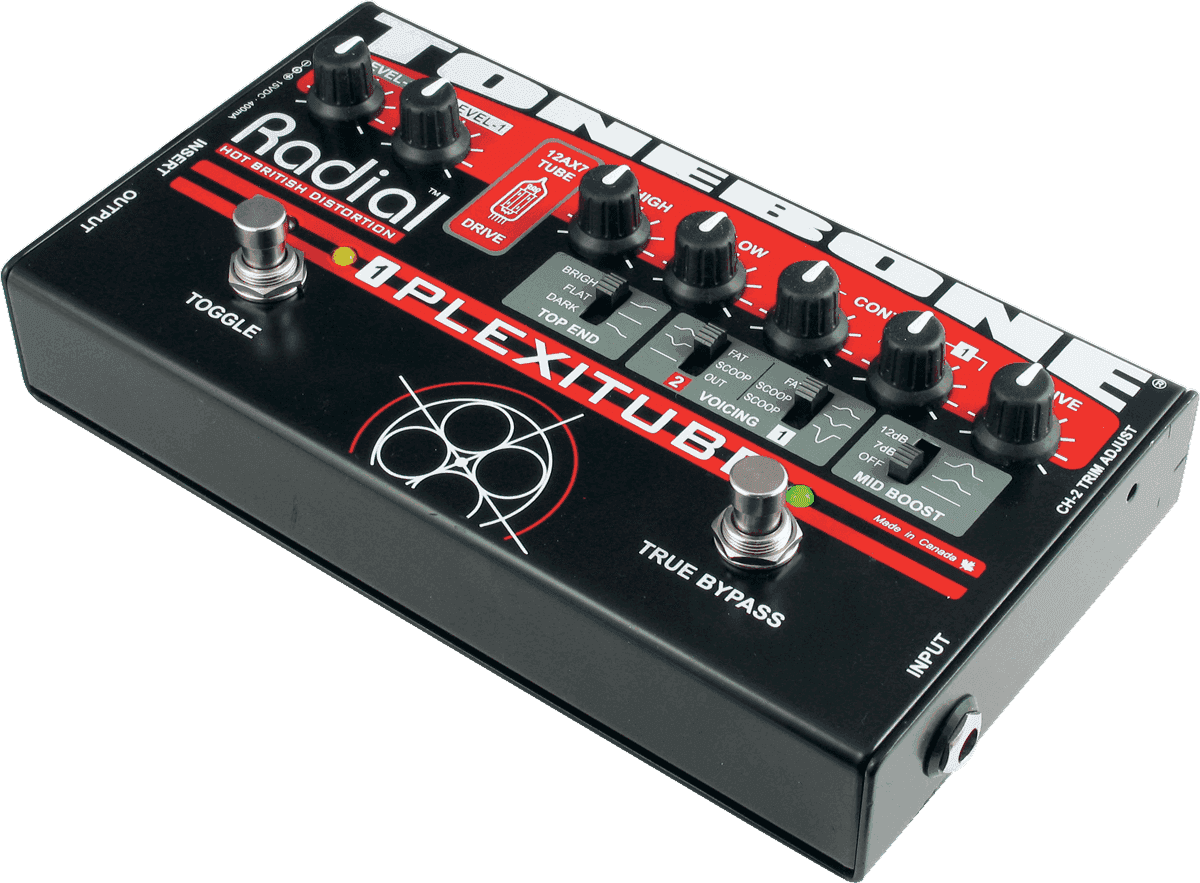 La radial Tonebone Plexitube est une pédale de saturation hybride équipée d'une lampe 12AX7 et trois étages de gain pour créer ses sons.Comme la Hot British, la Plexitube est basée sur le son du très réputé ampli Marshall et produit des sons qui vous emmènent d'un overdrive simple à des saturations extrêmes typées métal.Avec un véritable bypass, des canaux rhythm et lead, la Plexitube est idéale de la scène au studio.En plus du puissant EQ et du mid boost, chaque canal est équipé avec des contrôles séparés pour sculpter le son. Aussi,chaque canal est équipé de contrôles de volume séparés pour équilibrer le son quand vous passez d'un son clair à un son saturé.Le canal lead est équipé d'une boucle d'effets qui vous permet d'insérer un délai ou tout autre effet automatiquement lorsque le canal lead est activé.La pédale dispose également d'un réglage fin pour le gain du second canal qui vous permet d'ajuster la balance en gain entre les 2 canaux.La Plexitube est l'outil parfait et idéal pour tous les amoureux du son british.