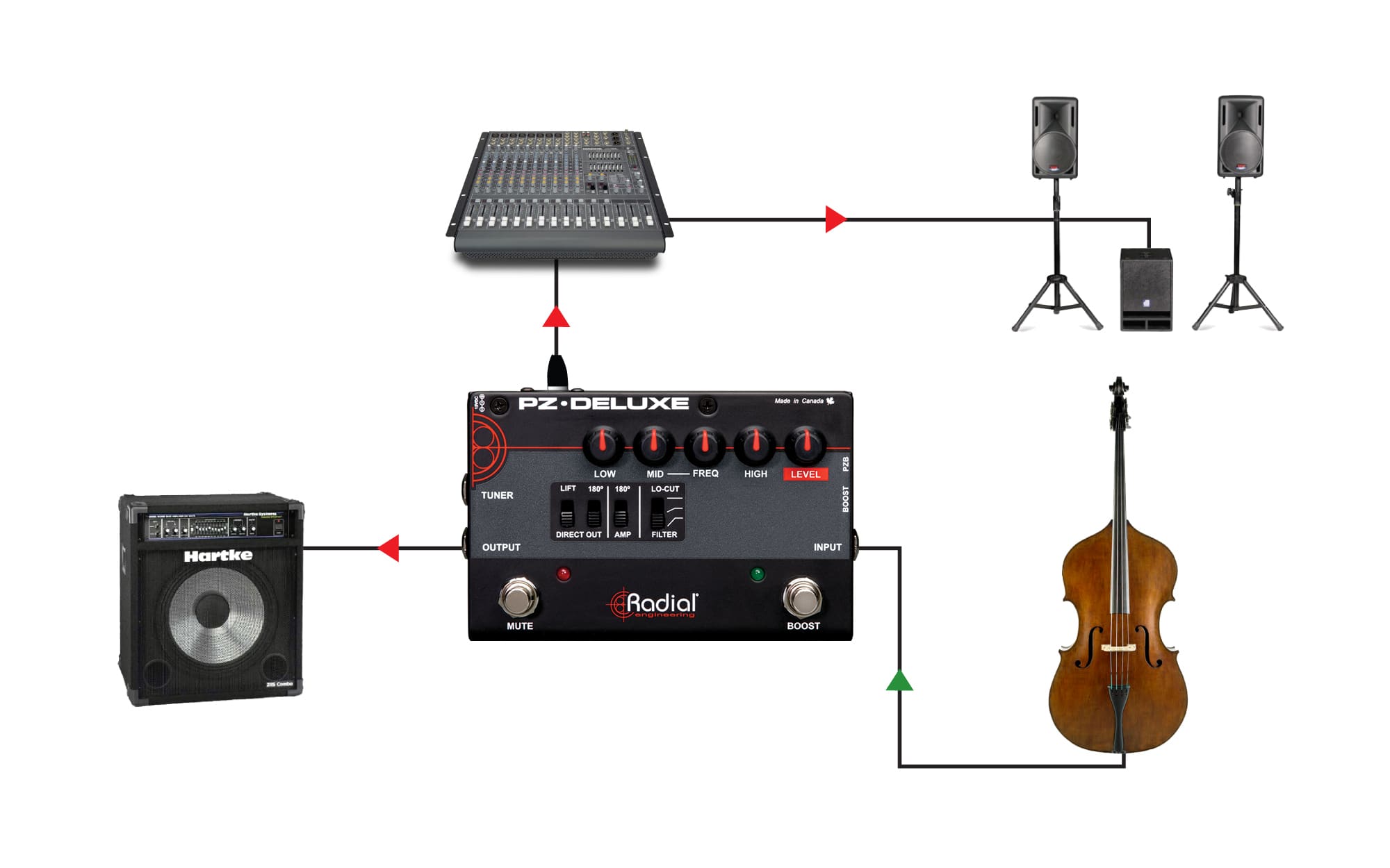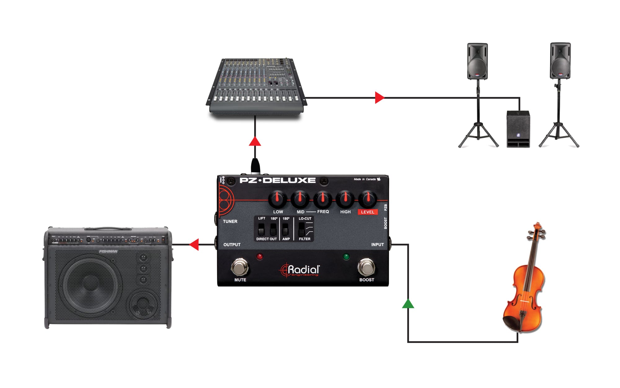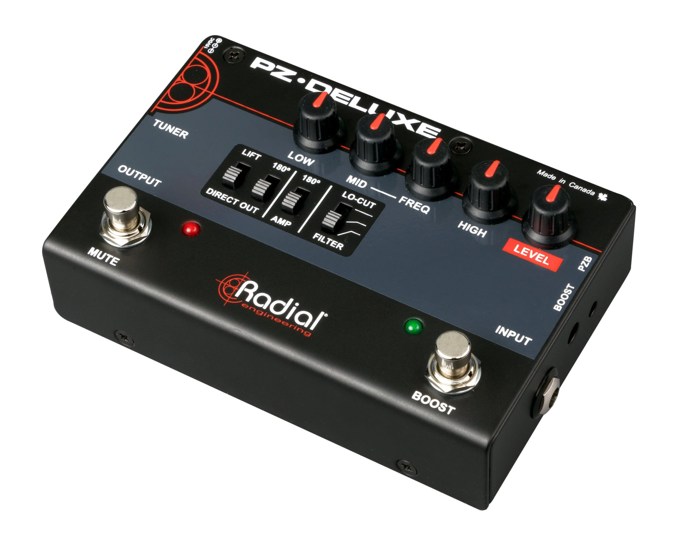 La PZ-Deluxe est la petite soeur de la PZ PRE. C'est un préampli instrument de qualité studio, mais dans une pédale plus compacte pour une utilisation live.Comme tous les préamplis RADIAL, cette pédale embarque des composants haut de gamme pour un son sans compromis à faible niveau de bruit.Elle est capable d'une dynamique exceptionnelle, s'adapte à tous les instruments, mais son terrain de prédilection est la guitare acoustique. La PZ Deluxe s'adaptera parfaitement à des contrebasses, mandolines et violons, peu importe quel type de système de sonorisation est employé.Pour les transducteurs piézoélectriques, un circuit spécial PZB de gain peut être enclenché, qui augmente l'impédance d'entrée à 10 M Ohms afin d'éliminer les plops et autres parasites. Ceci écarte la nécessité d'un préampli dédié.Même si les contrôles ne sont pas si pléthoriques que sur sa grande sœur, elle dispose quand même d'un gain d'entrée, un EQ 3-bandes semi-paramétrique à médium variable, un filtre 3 positions destiné aux basses fréquences et un commutateur d'inversion de phase.La sortie jack se destine à un amplificateur artiste tandis que la sortie DI XLR se charge d'alimenter un système de sonorisation.La basse impédance de sortie symétrique de la PZ-Deluxe permet d'avoir de grandes longueurs câbles à disposition (de plus de 100 mètres) en évitant au maximum les parasitages.Une sortie tuner séparée permet de s'accorder sur scène silencieusement en appuyant sur la touche 'Mute'. Et pour les solos, un autre circuit de gain variable, avec contrôle de niveau, vous permet de passer 'devant' dans le mix lorsque cela est nécessaire.
