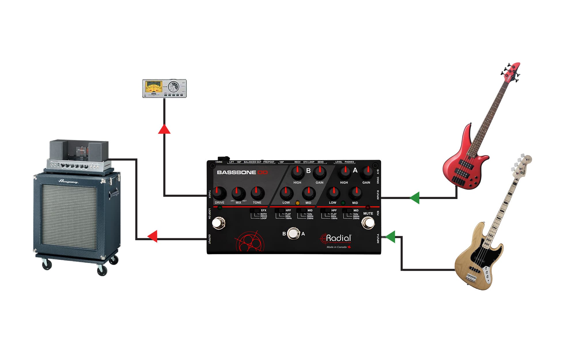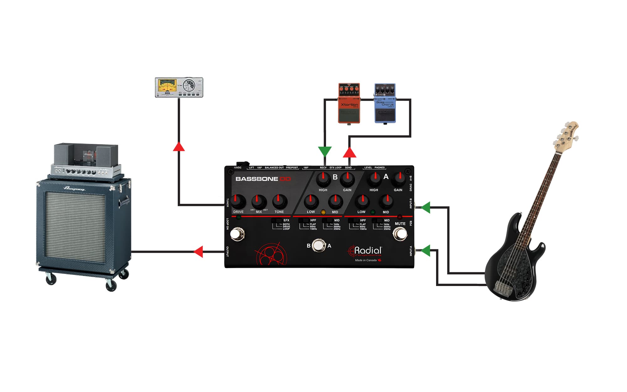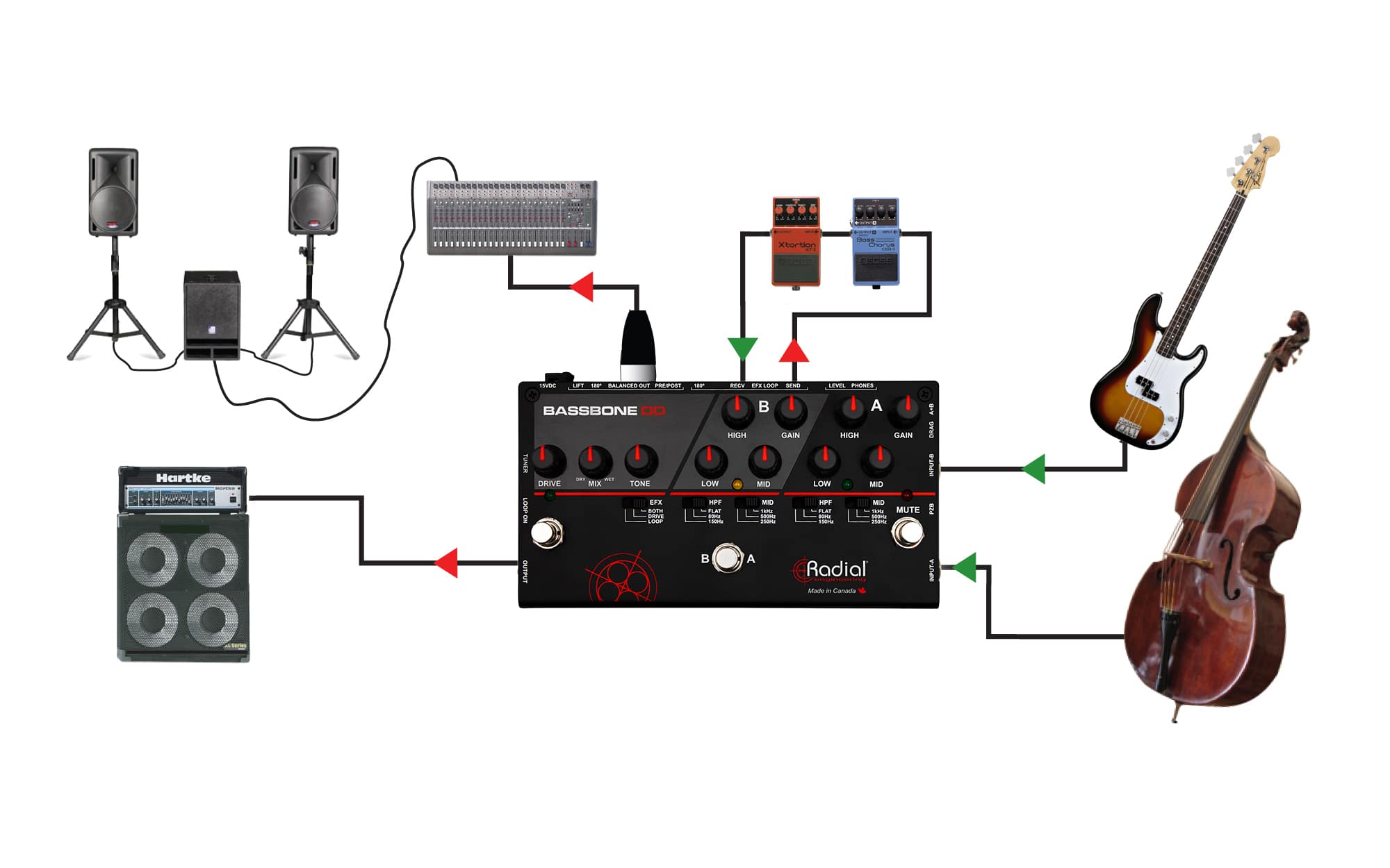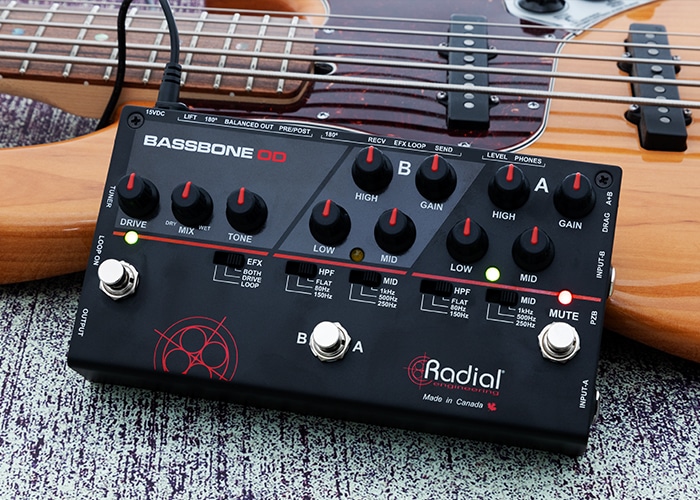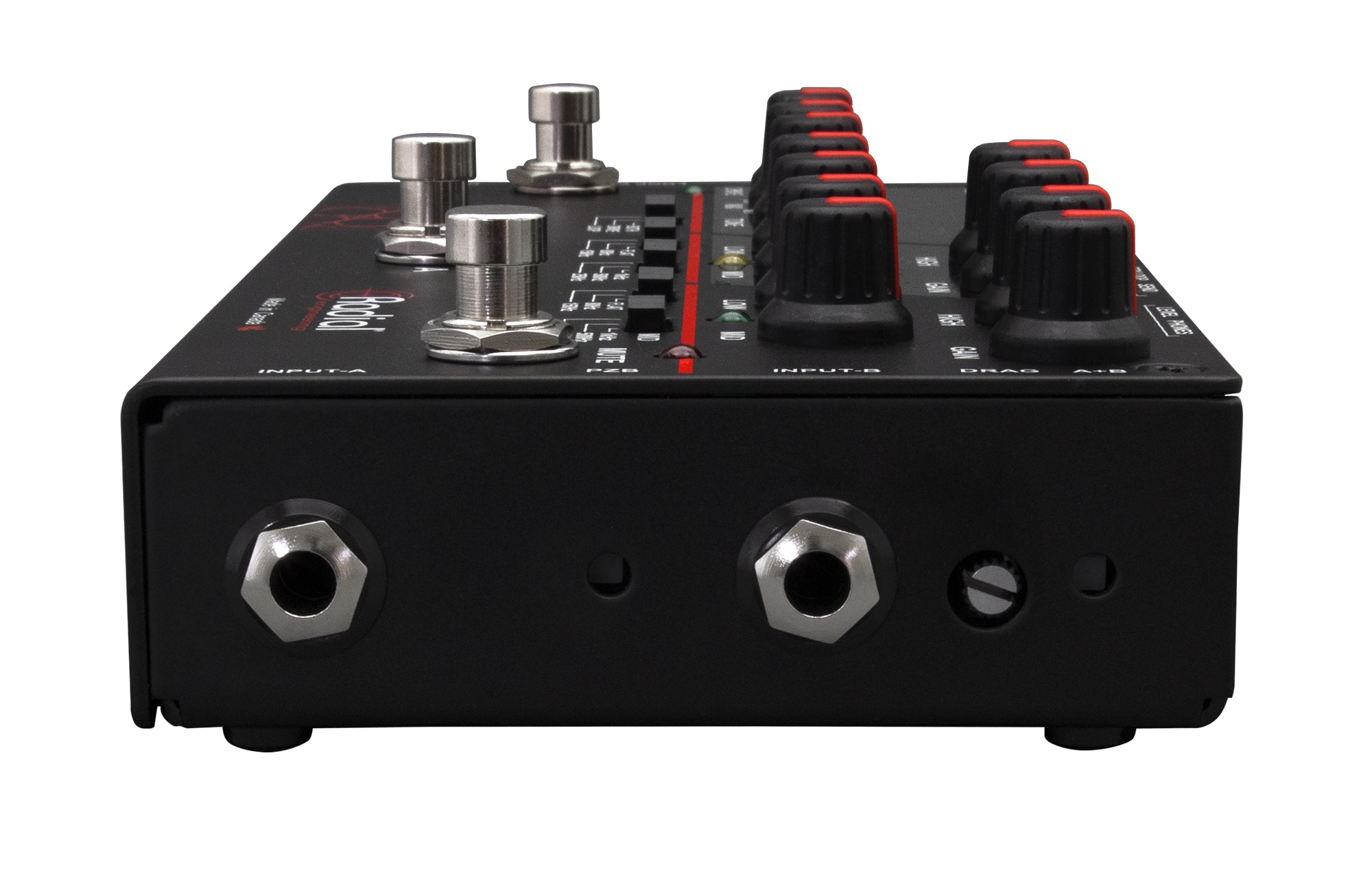 Le Bassbone OD est un préampli basse avec 2 entrées instrument, dont chacune dispose de son contrôle de niveau, d'un égaliseur passif interactif super puissant et d'un filtre basse fréquence pour aider à éliminer les résonances.Le canal A est équipé d'un footswitch PZB qui augmente la sensibilité et la charge à 10 Mohms afin d'optimiser la réponse pour les capteurs piézo-électriques régulièrement employés à la contrebasse.Le canal B, quant à lui, agit sur la correction de charge (impédance) qui vise à optimiser la réponse d'un instrument passif comme une basse électrique vintage.La bascule entre les canaux se fait en utilisant le footswitch et les 2 canaux peuvent être mélangés en appuyant sur l'interrupteur de 'blend', si un système de micro double est employé.Le Bassbone OD est également pourvu d'une sortie instrument en jack (6,35 mm) pour attaquer un ampli sur scène et une sortie symétrique DI à faible impédance pour un système de sonorisation.La sortie XLR peut être assignée 'pre ou post' effets en fonction des préférences de l'ingénieur.Une sortie tuner 'bufferisée' dédiée travaille avec le commutateur au pied MUTE pour un accordage silencieux sur scène.Pour les bassistes qui utilisent des effets, les 2 canaux d'entrée peuvent partager les mêmes pédales en se connectant via la boucle d'effets. Le tout agrémenté d'une section overdrive embarquée avec contrôles de DRIVE, LEVEL et TONE. Un mélange 'wet/dry' vous permet d'ajouter un léger grain semblable à un Ampeg SVT ou bien une grosse distorsion si désiré.La pédale d'OD peut être affectée à la boucle, overdrive ou les deux.Enfin, un ampli casque intégré avec sortie jack (3,5 mm) vous permet d'utiliser la Bassbone dans le bus pour les longs trajets entre les concerts.Le Bassbone OD, le préampli basse le plus puissant du monde dans une seule pédale.
