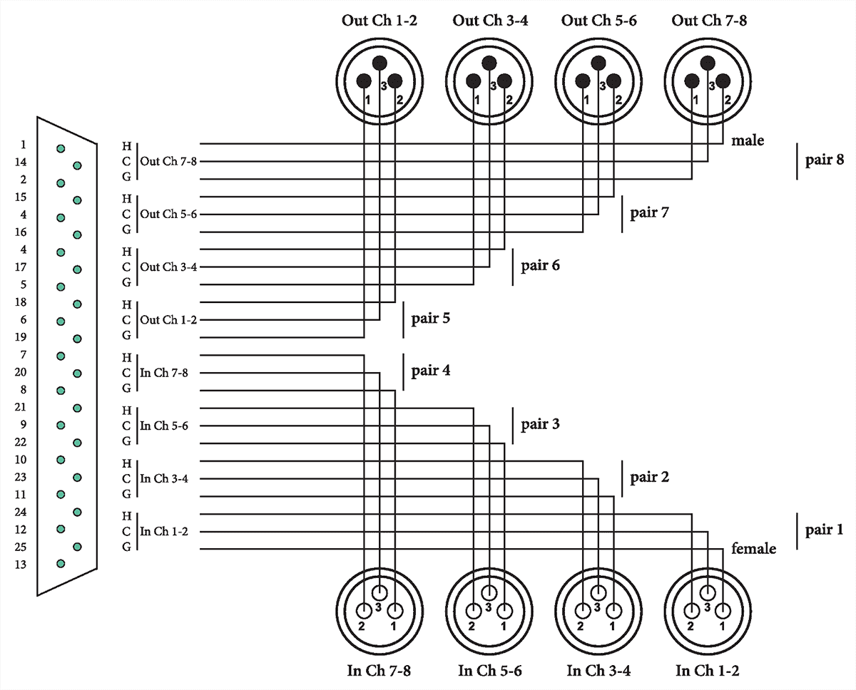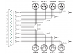 Le hub de connexion Sub-D à 25 broches, qui permet de raccorder à une table de mixage ou à un magnétophone différents types de connecteurs, comme ici 4 connecteurs XLR mâles et 4 XLR femelles, est un modèle développé par Tascam pour devenir progressivement un standard de l'industrie audio pro. Ainsi offre-t-il une large compatibilité avec de nombreux appareils de différentes marques, comme Avid, Digidesign, RME ou Universal Audio.