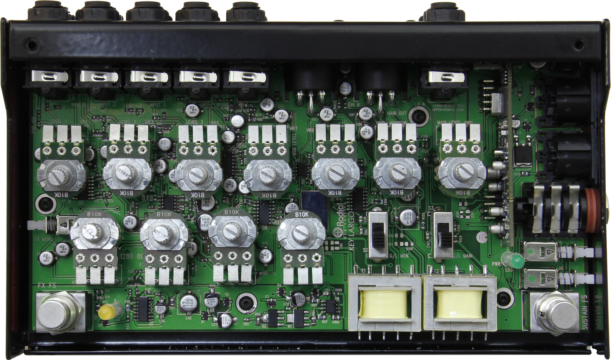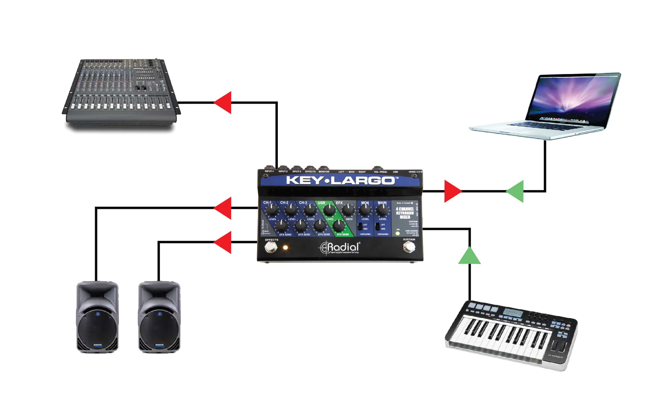 Conçue pour la scène, la Key-Largo permet de connecter jusqu'à trois claviers stéréo, des pédales d'effets et de volume, ainsi qu'un ordinateur portable via USB. Elle gère tous ces signaux pour envoyer un flux audio symétrique à un système de sonorisation, garantissant ainsi une performance scénique sans faille. Trois entrées analogiques stéréo disposent de réglages de volume individuels pour équilibrer les niveaux, et chacune peut être reliée à une boucle d'effets partagée pour ajouter instantanément de la réverbération ou du délai grâce à une pédale dédiée. Une connexion USB permet d'intégrer un ordinateur portable à la configuration pour contrôler des synthétiseurs virtuels. Une pédale de sustain intégrée et des connexions pour une pédale de volume stéréo offrent des possibilités supplémentaires pour contrôler votre jeu.
