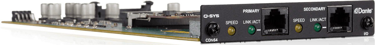 Permet d’intégrer jusqu'à 64x64 canaux audio à 48 kHz depuis un réseau Dante ™ directement dans l'écosystème Q-SYS pour disposer du traitement avancé disponible dans les CORE. La carte d’interface Dante CDN64 est idéale pour une utilisation dans des lieux de spectacles tels que les théâtres, les auditoriums, les centres de congrès.