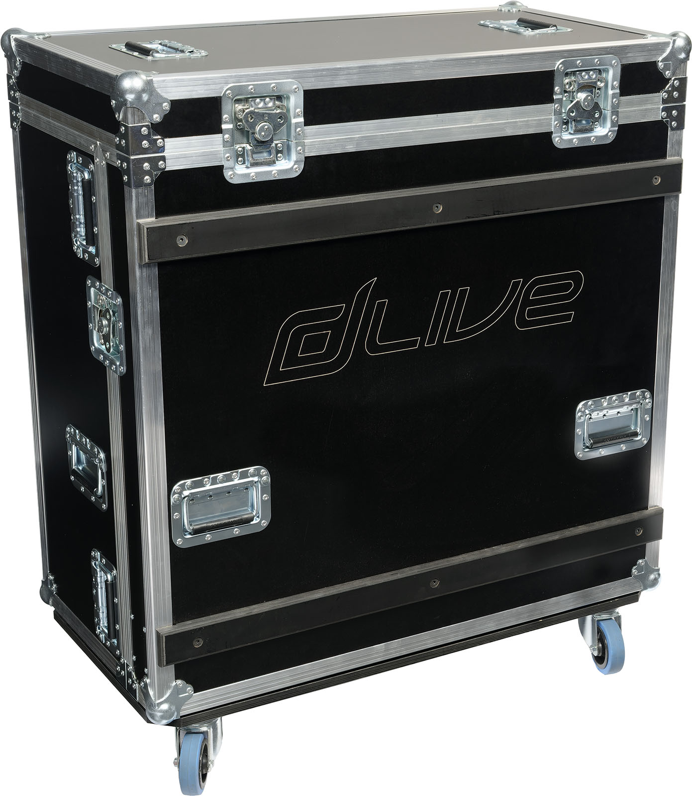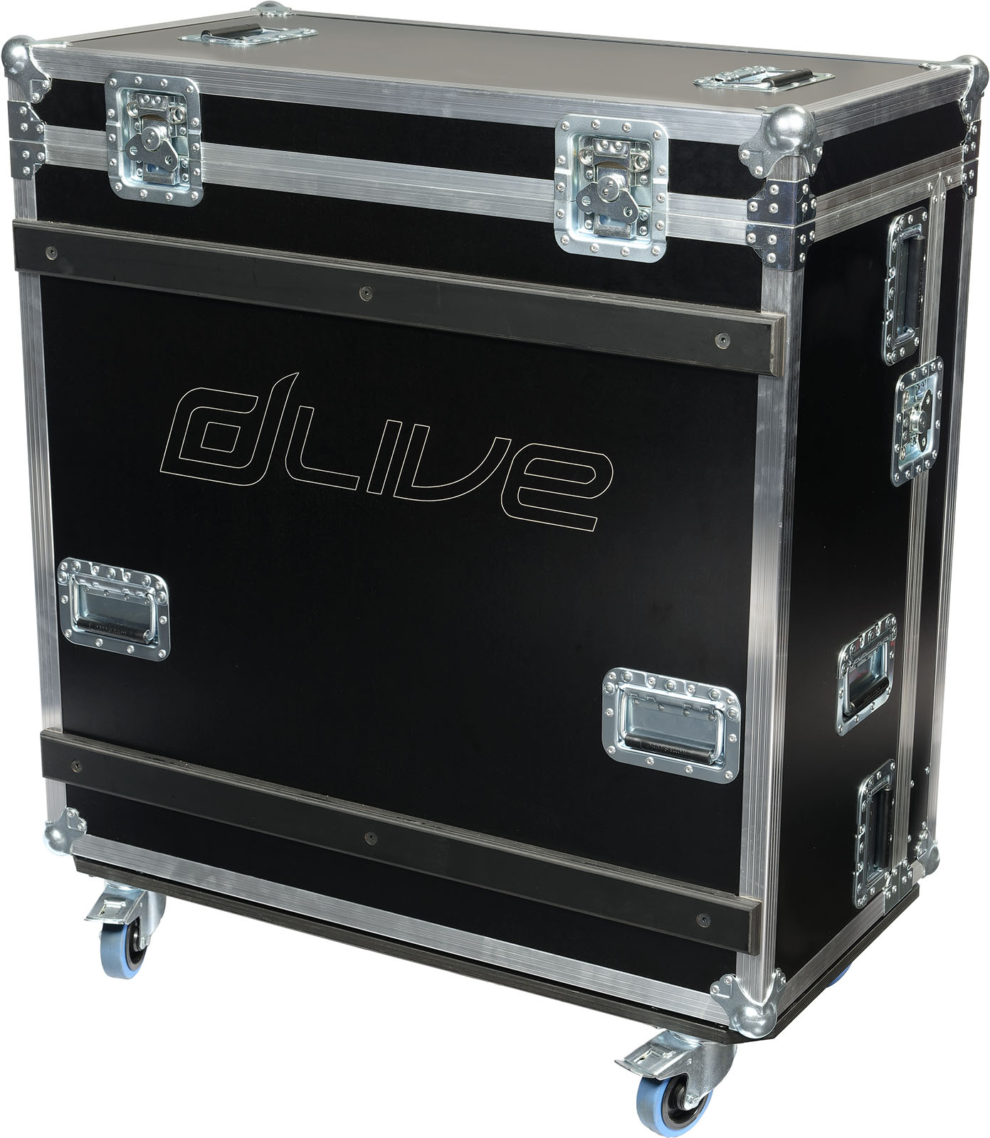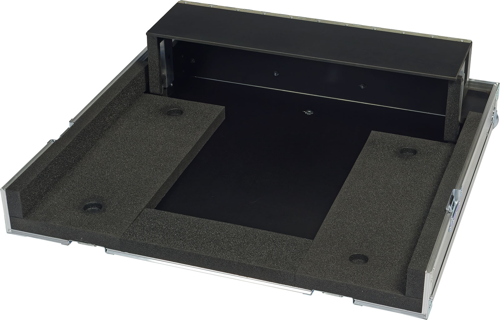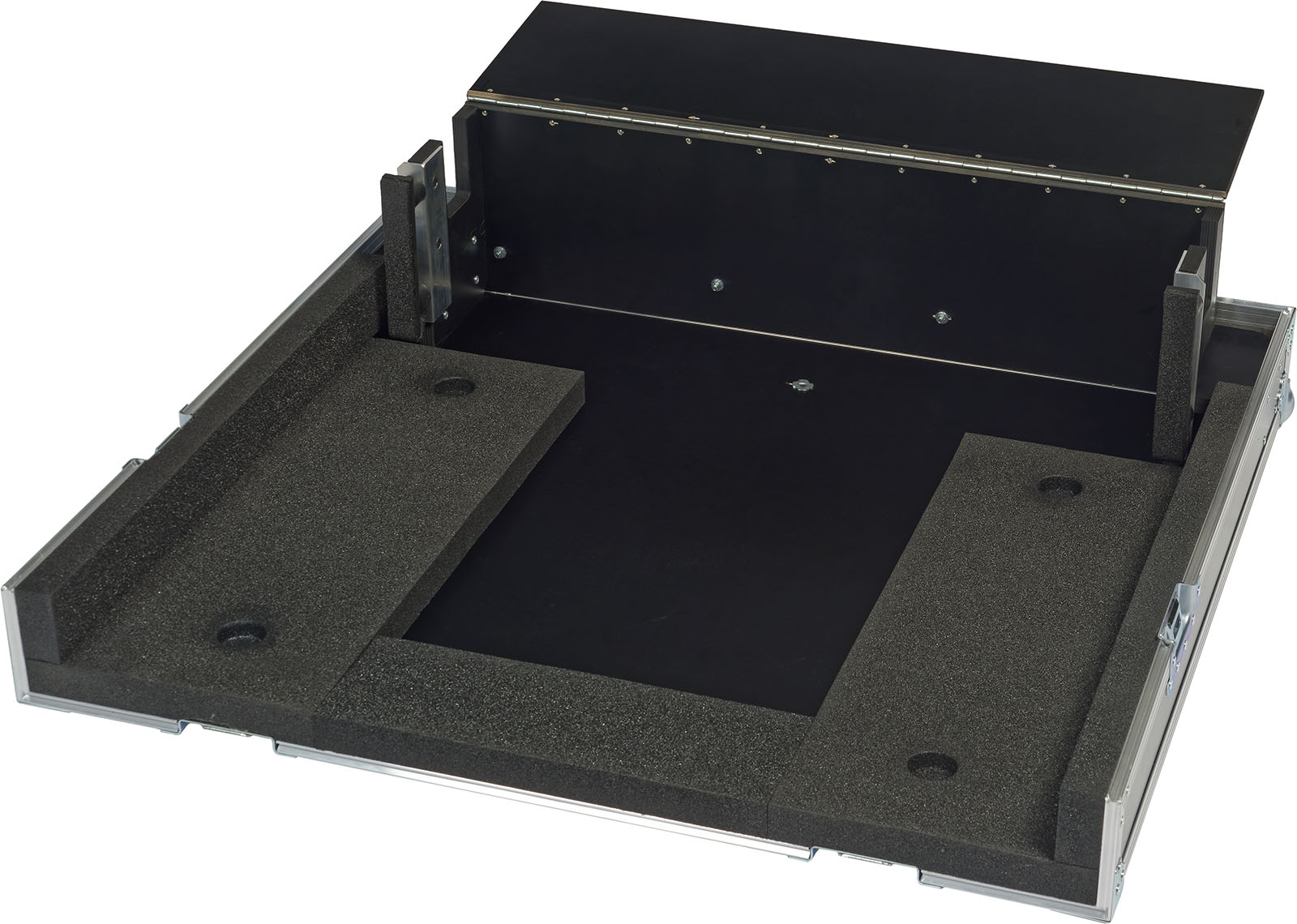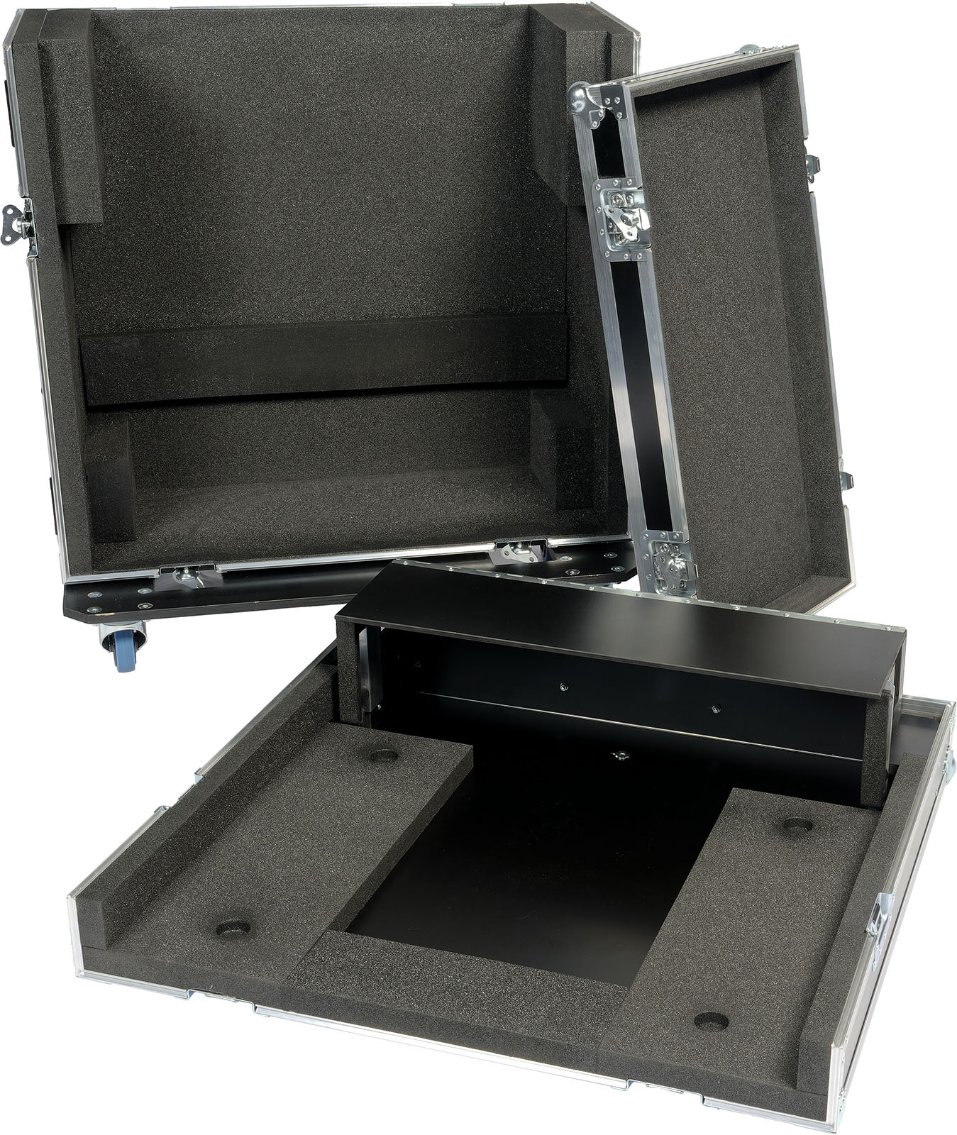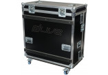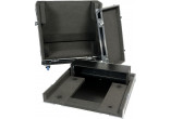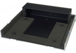 Flight case avec bac articulé arrière et suspendu sur roulettes par 4 silent-blocs
