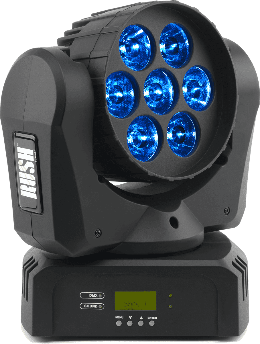 Compact yet powerful, this fast and agile LED wash light moving head features RGBW color mixing. Unique wash beam effects are possible with auto trig shows and music trig sound activation.