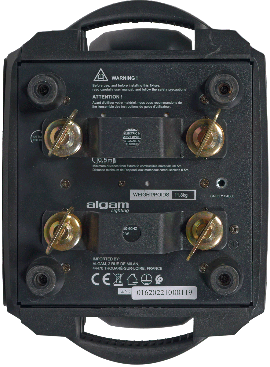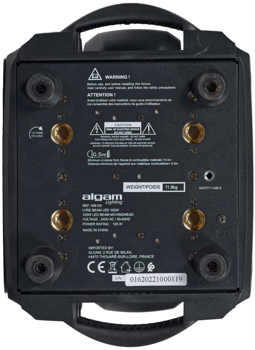 La MB100 est conçue pour une utilisation professionnelle intensive. Son châssis robuste assure une grande robustesse, tandis que son indice de protection IP20 la rend adaptée à une utilisation en intérieur. La lyre est équipée d'une alimentation avec entrée et sortie Powercon pour le chaînage des appareils, et de deux embases OMEGA pour une installation sécurisée en toutes circonstances, même en position inversée.