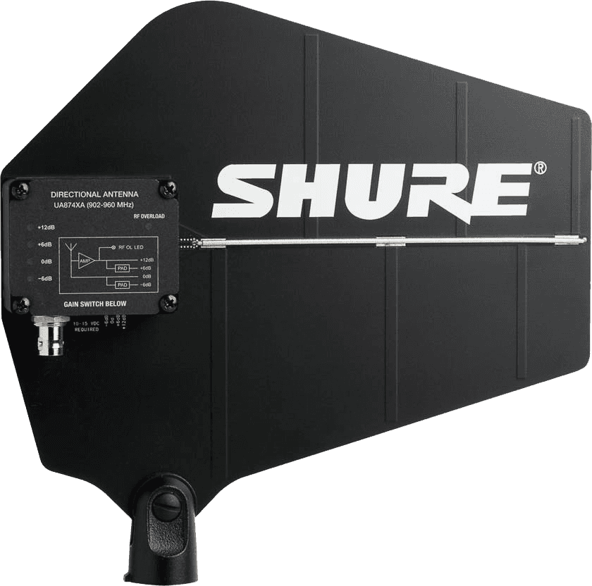 Antenne dipôle log-périodique amplifiée large bande. Elle intègre un sélecteur de gain externe à 4 positions et une LED indiquant la saturation RF. Les récepteurs BLX4RE, SLX4E, SLXD4E, SLXD4DE et QLXD4E nécessitent un adaptateur UABIAST-E pour alimenter chaque antenne via le câble coaxial (deux pour une réception Diversity).