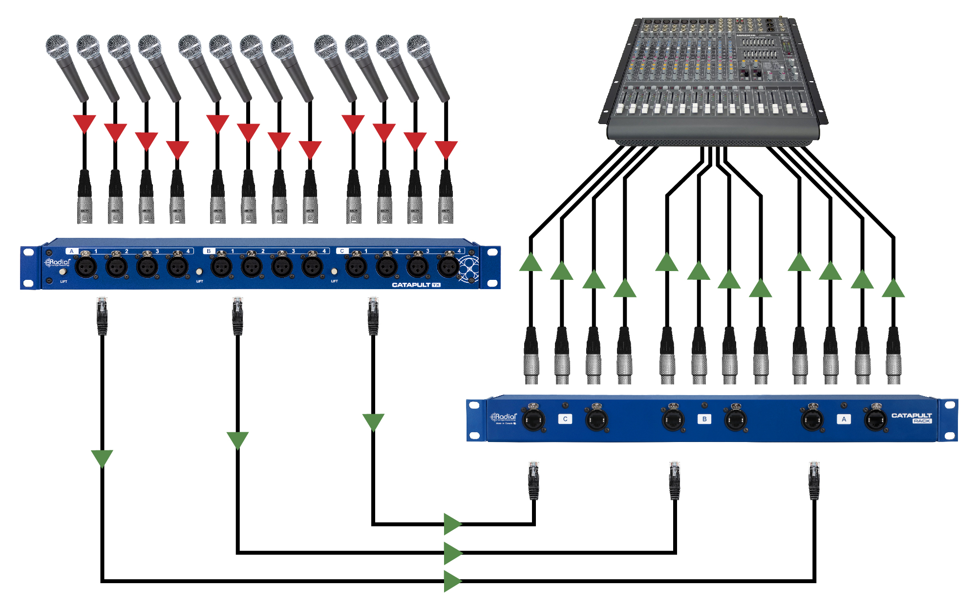 Les Catapult Rack TX et RX permettent de transmettre des signaux micro ou ligne d'un point à un autre sans perte, bruit ni interférence, et sans conversion audio numérique. Ils utilisent pour cela les paires torsadées de conducteurs d'un câble Cat 5, comme pour un système de câblage audio analogique multicanal classique. Les unités Catapult Rack fonctionnent comme trois modules dans un seul châssis. Chaque câble Ethernet Cat 5 pouvant transporter quatre canaux, les 12 connecteurs XLR de chaque Catapult Rack sont répartis en trois groupes, chacun doté de son propre commutateur de mise à la terre pour éliminer les parasites et de prises Ethernet RJ45 sur le panneau arrière. Vous pouvez utiliser trois câbles Ethernet pour connecter les 12 canaux à un seul point ou les répartir vers n'importe quel boîtier de scène Radial Catapult, ce qui vous permet de créer un système de câblage audio entièrement personnalisable.