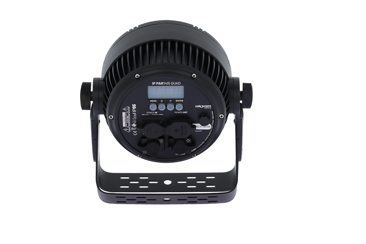 Bénéficiant d'une protection IP65, le IP PAR 1415 QUAD est équipé d'une connectique Seetronic scellée sur la machine, et est livré avec des câbles d'alimentation PowerCon et DMX IP afin d'éviter toute infiltration dans les connecteurs. Très complet, ce projecteur est capable de fonctionner en mode automatique, de réagir à la musique ambiante, d'être contrôlé via un contrôleur DMX ou un appareil maître, et peut également être paramétré via le clavier de commande présent au dos.