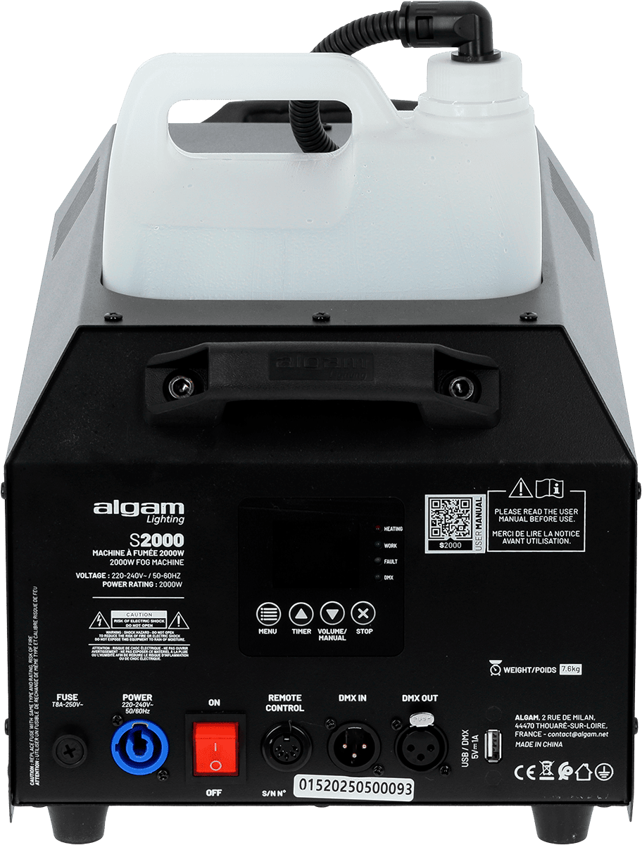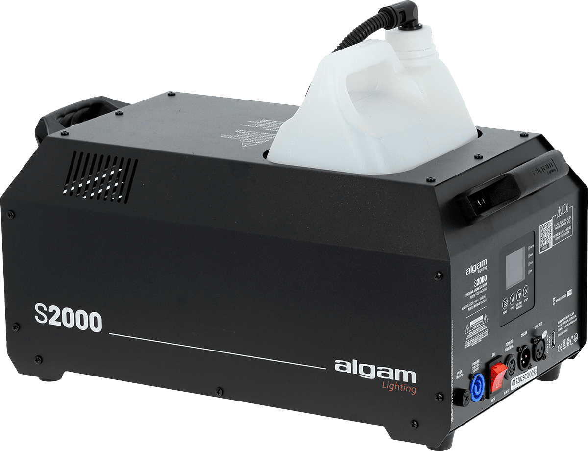 Grâce à son réservoir de 5 litres, la S2000 offre une autonomie prolongée pour des prestations longues sans interruption. Son bouchon adaptateur fourni permet d’utiliser directement les bidons de liquide à fumée Algam Lighting de 5 litres, évitant les manipulations inutiles et réduisant le temps de recharge. Cette configuration simplifie la logistique et assure un fonctionnement continu, même lors d’événements intensifs.