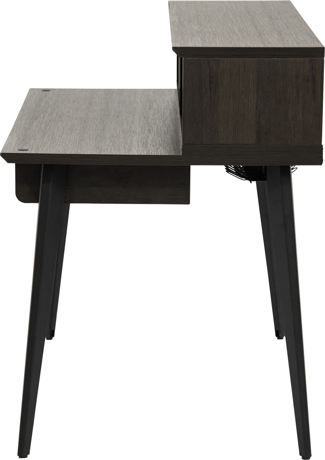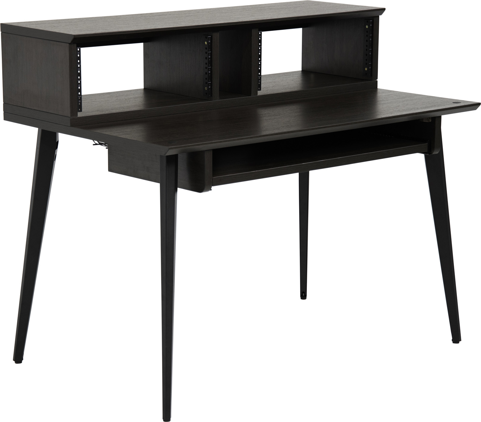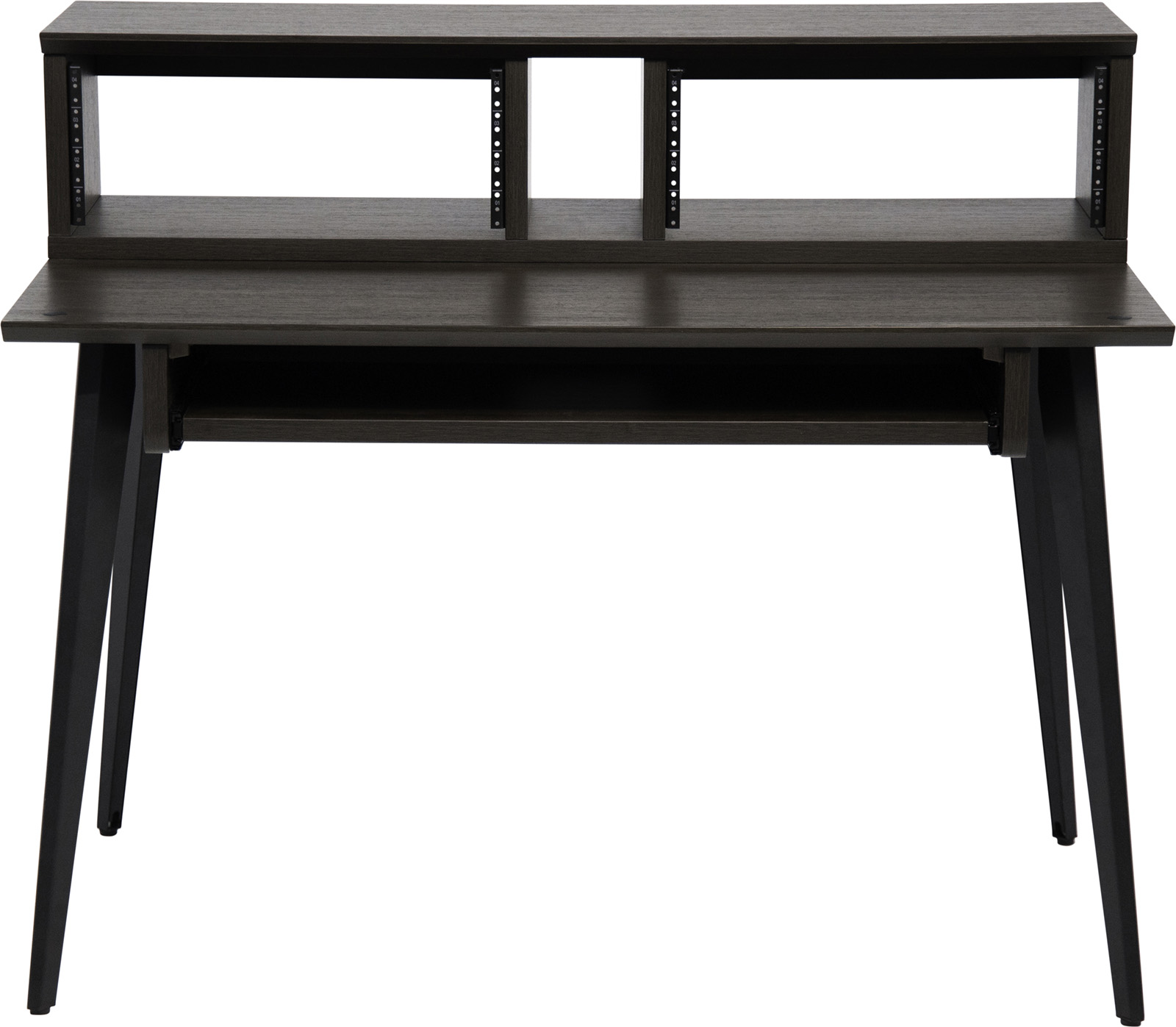 La plateforme supérieure mesure 1200 mm de longueur x 356 mm de profondeur, offrant ainsi suffisamment de surface pour poser une paire de petites à grandes enceintes de studio et un écran plat. La plateforme inférieure offre une profondeur totale de 432 mm, idéale pour un petit contrôleur MIDI, un clavier ou une table de mixage. Le GFW-ELITEDESK-BRN dispose de huit (8) unités d'espace pour rack afin de garder à portée de main les interfaces audio, les processeurs dynamiques, les préamplis ou tout autre équipement externe, ainsi qu'un tiroir coulissant pour accueillir un clavier d'ordinateur ou un clavier MIDI de 49 touches. Vous pouvez choisir entre un rack central 4U ou une configuration à double rack 4U à l'aide des séparateurs mobiles. Pour préserver davantage l'espace sur le bureau, des trous pré-percés sur la surface inférieure permettent de monter des modèles de bras de microphone de bureau Frameworks. Pour gérer les câbles, il suffit de les faire passer dans le système d'organisation des câbles sous le bureau, qui comprend des panneaux internes amovibles sur les jambes pour un routage supplémentaire. Des pieds de nivellement sont également inclus pour assurer une stabilité accrue lorsque le bureau est placé sur des surfaces de sol inégales.