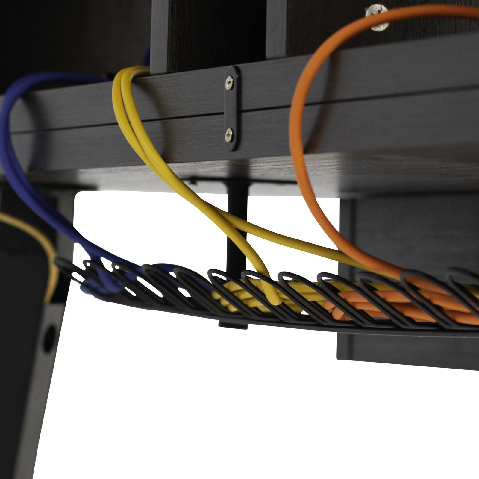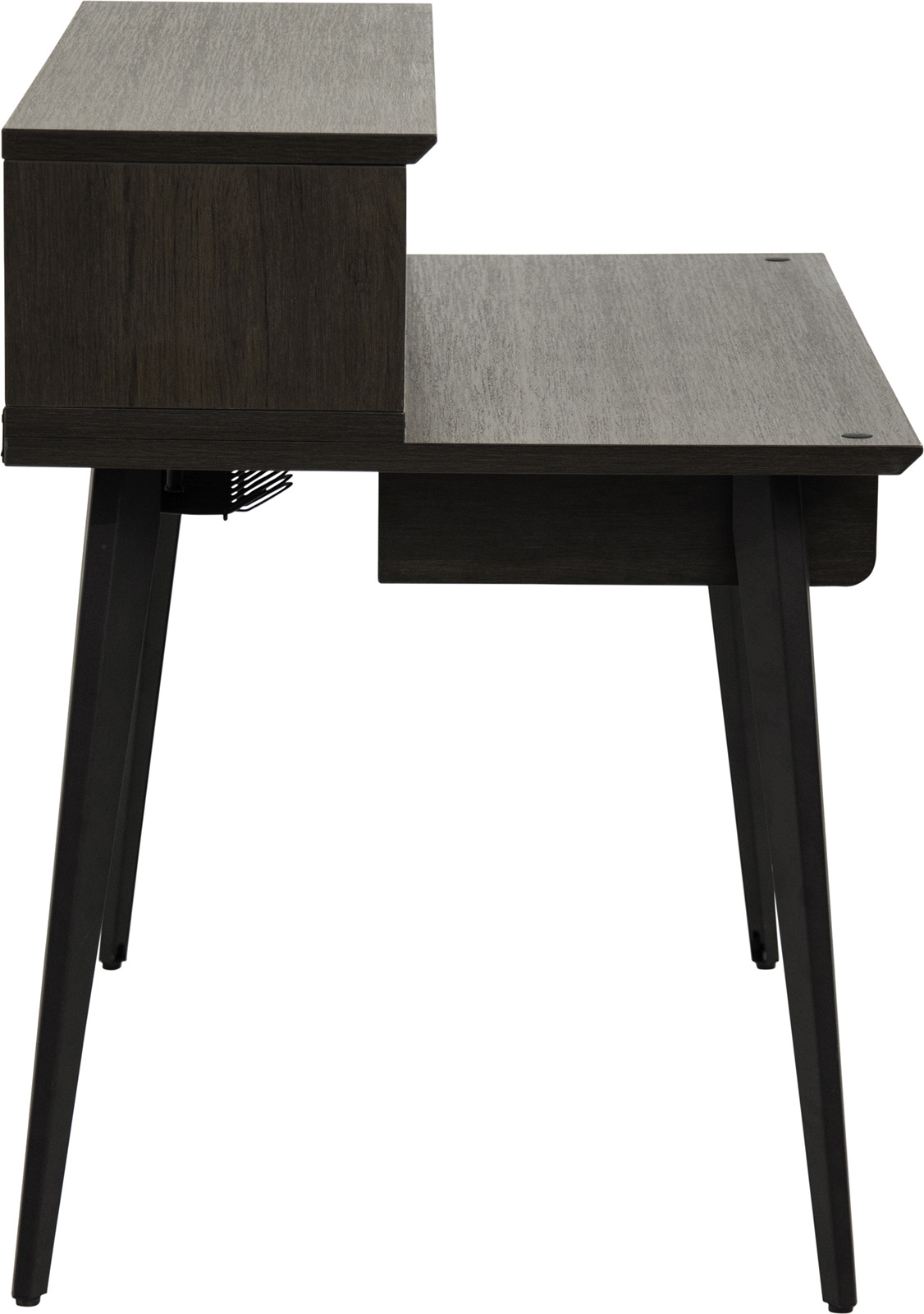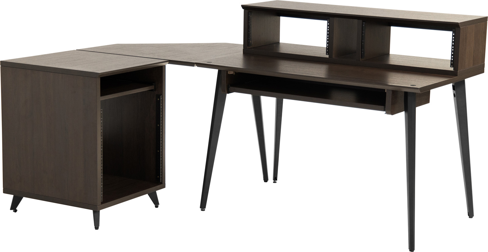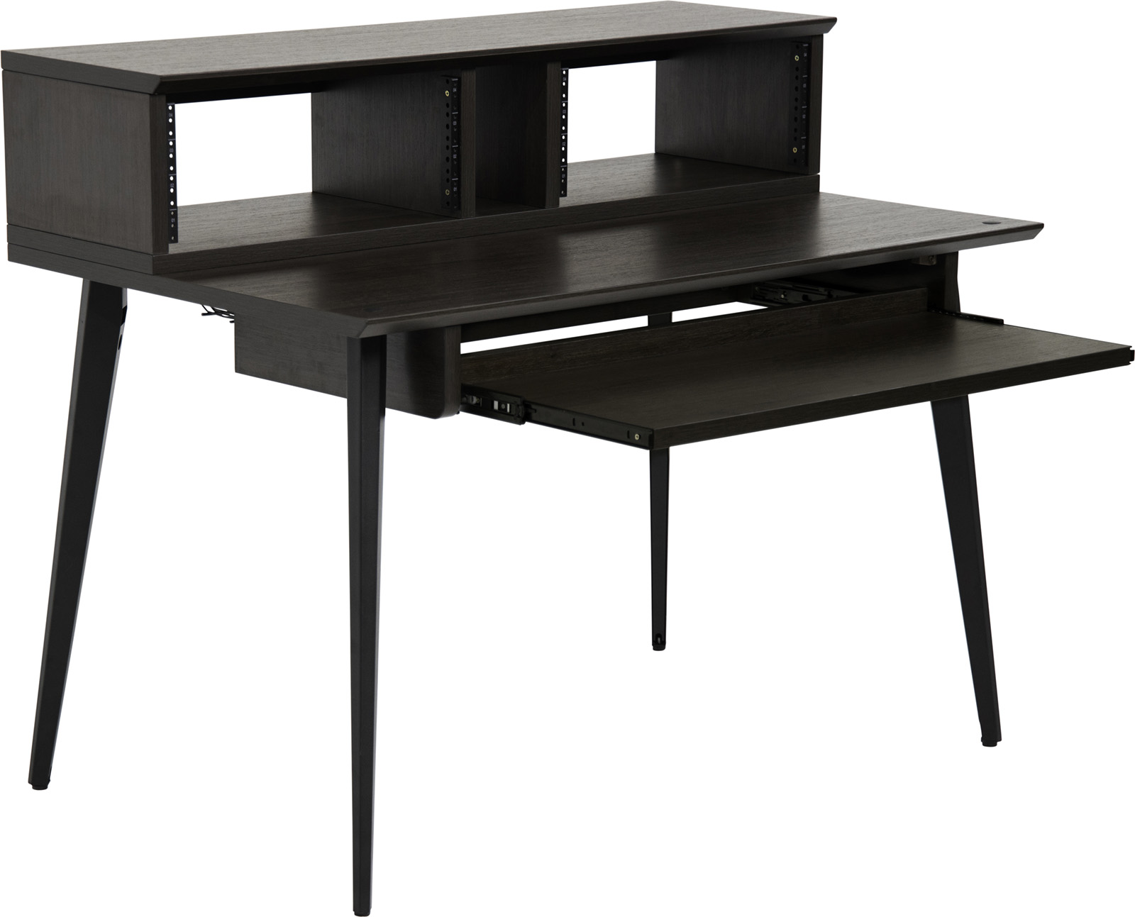 La plateforme supérieure mesure 1200 mm de longueur x 356 mm de profondeur, offrant ainsi suffisamment de surface pour poser une paire de petites à grandes enceintes de studio et un écran plat. La plateforme inférieure offre une profondeur totale de 432 mm, idéale pour un petit contrôleur MIDI, un clavier ou une table de mixage. Le GFW-ELITEDESK-BRN dispose de huit (8) unités d'espace pour rack afin de garder à portée de main les interfaces audio, les processeurs dynamiques, les préamplis ou tout autre équipement externe, ainsi qu'un tiroir coulissant pour accueillir un clavier d'ordinateur ou un clavier MIDI de 49 touches. Vous pouvez choisir entre un rack central 4U ou une configuration à double rack 4U à l'aide des séparateurs mobiles. Pour préserver davantage l'espace sur le bureau, des trous pré-percés sur la surface inférieure permettent de monter des modèles de bras de microphone de bureau Frameworks. Pour gérer les câbles, il suffit de les faire passer dans le système d'organisation des câbles sous le bureau, qui comprend des panneaux internes amovibles sur les jambes pour un routage supplémentaire. Des pieds de nivellement sont également inclus pour assurer une stabilité accrue lorsque le bureau est placé sur des surfaces de sol inégales.