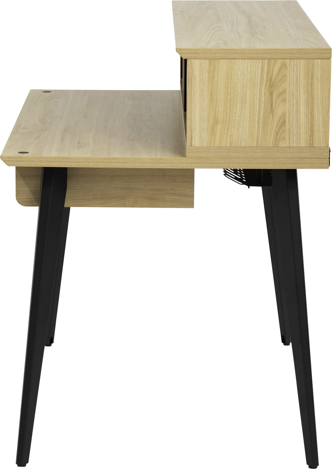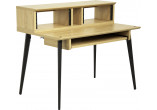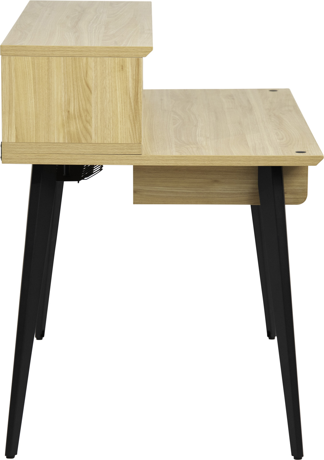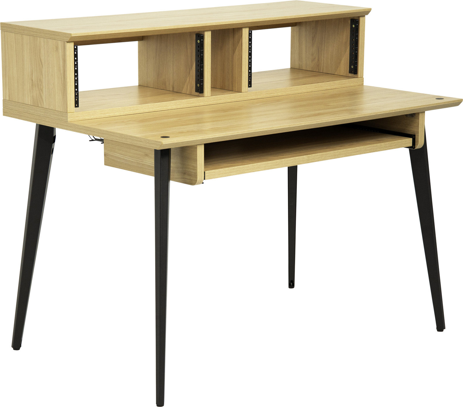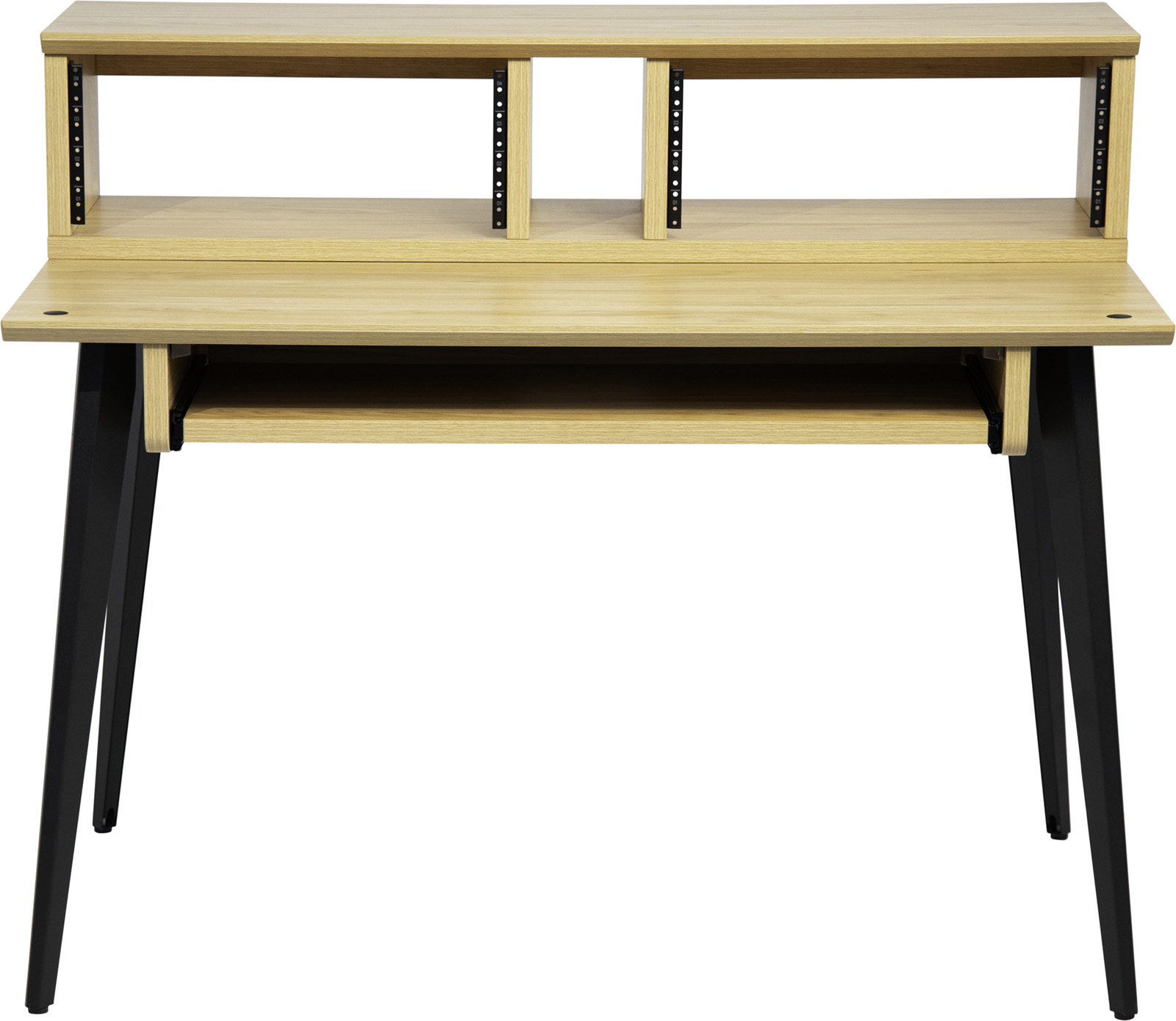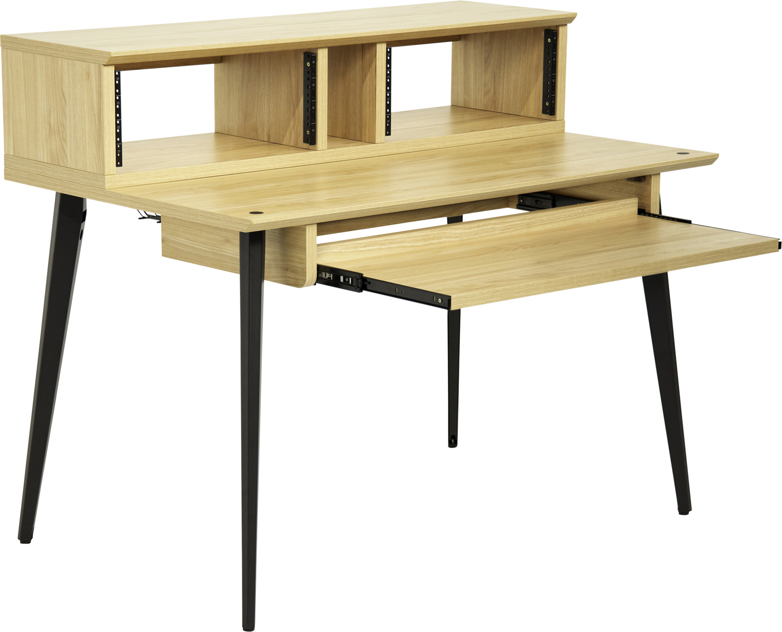Le bureau central GFW-ELITEDESK-MPL de la série Elite Furniture de Gator est une station de travail à la fois élégante et ergonomique, idéale pour les podcasts, les diffusions, la création de contenu, les jeux vidéo, le streaming et l'enregistrement à domicile. Sa finition texturée en érable naturel s'intègre parfaitement à votre décoration intérieure, tandis que sa conception à double niveau et son système de rack personnalisable offrent un grand espace pour les équipements essentiels. La plateforme supérieure mesure 1200 mm de longueur x 356 mm de profondeur, offrant ainsi suffisamment de surface pour poser une paire de petites à grandes enceintes de studio et un écran plat. La plateforme inférieure offre une profondeur totale de 432 mm, idéale pour un petit contrôleur MIDI, un clavier ou une table de mixage. Le GFW-ELITEDESK-MPL dispose de huit (8) unités d'espace pour rack afin de garder à portée de main les interfaces audio, les processeurs dynamiques, les préamplis ou tout autre équipement externe, ainsi qu'un tiroir coulissant pour accueillir un clavier d'ordinateur ou un clavier MIDI de 49 touches. Vous pouvez choisir entre un rack central 4U ou une configuration à double rack 4U à l'aide des séparateurs mobiles. Pour préserver davantage l'espace sur le bureau, des trous pré-percés sur la surface inférieure permettent de monter des modèles de bras de microphone de bureau Frameworks. Pour gérer les câbles, il suffit de les faire passer dans le système d'organisation des câbles sous le bureau, qui comprend des panneaux internes amovibles sur les jambes pour un routage supplémentaire. Des pieds de nivellement sont également inclus pour assurer une stabilité accrue lorsque le bureau est placé sur des surfaces de sol inégales.