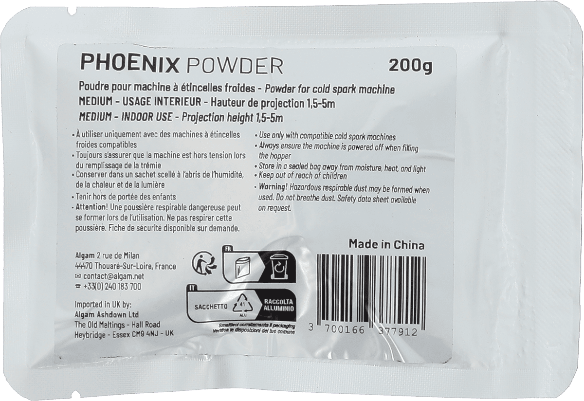 Créez des effets spectaculaires en toute sécurité avec la poudre pour machine à étincelles froides Algam Lighting. Conditionné en sachet de 200g, ce consommable est spécialement conçu pour une utilisation avec les machines Algam Lighting Phoenix Mini et Phoenix, offrant une hauteur de projection de 1,5 à 5 mètres. Idéal pour les événements, concerts, ou mariages, ce sachet de poudre vous permet de créer des gerbes d'étincelles éblouissantes sans chaleur, fumée ni odeur.