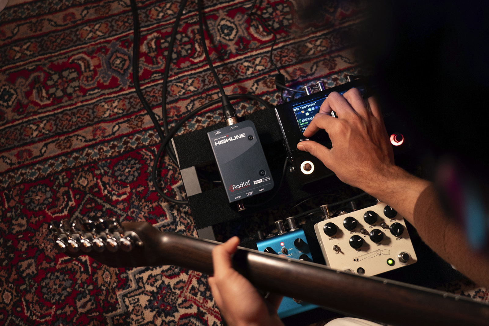Les guitaristes et bassistes qui utilisent des modélisateurs d'amplis sur leur pedalboard sont confrontés à un ensemble de problèmes particuliers : bien que les simulateurs d'amplis puissent produire des sorties de niveau ligne, ils utilisent souvent des connecteurs asymétriques 1/4" qui ne supportent pas les longs câbles sans dégrader le son de l'instrument, et ils sont particulièrement sensibles au bruit des boucles de masse lorsqu'ils sont connectés directement à la sono. Le Highline résout ces problèmes en insérant un transformateur 1:1 dans le chemin du signal, qui assure l'isolation pour réduire le bruit, protège contre l'alimentation fantôme et maintient le signal au niveau ligne pour une connexion directe au système de sonorisation.