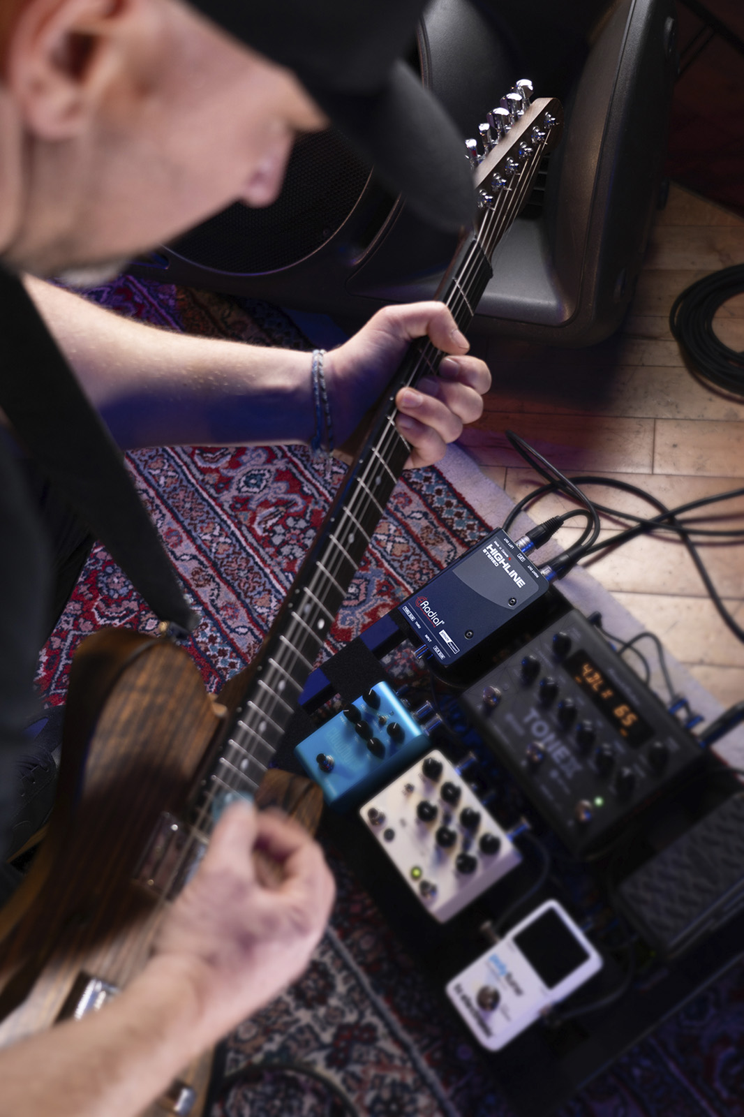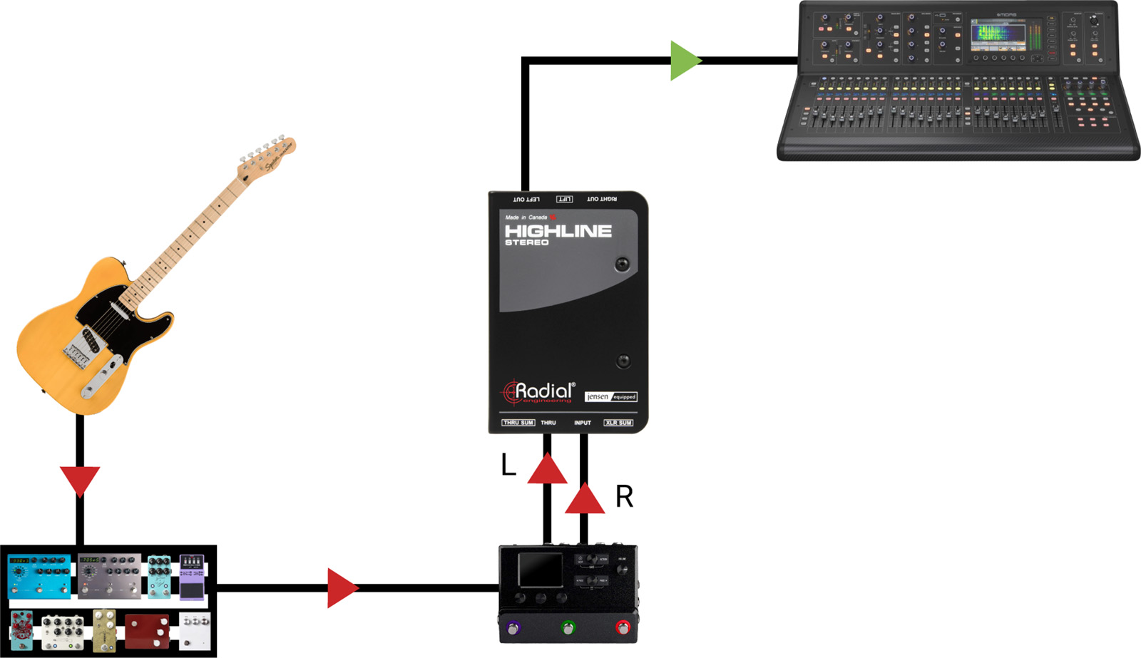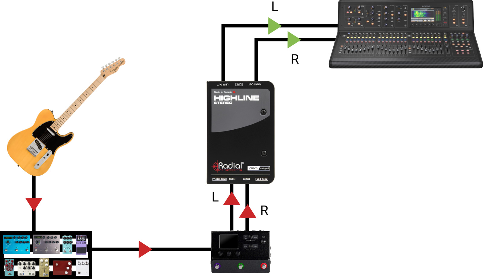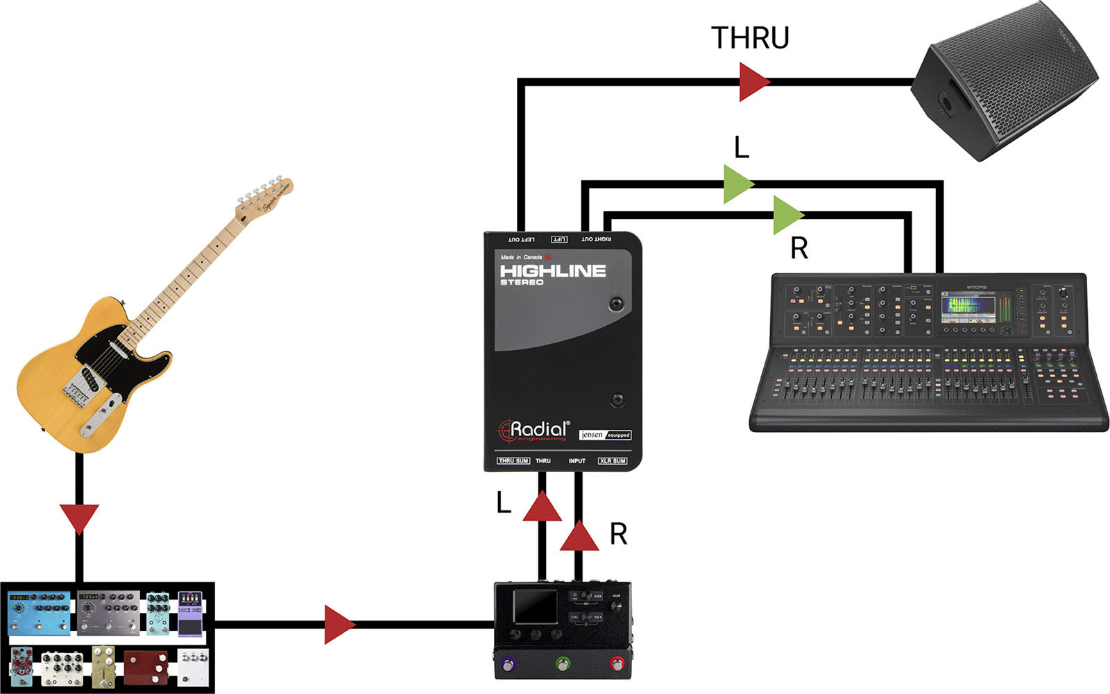 Les guitaristes et bassistes qui utilisent des modélisateurs d'amplis sur leur pedalboard sont confrontés à un ensemble de problèmes particuliers : bien que les simulateurs d'amplis puissent produire des sorties de niveau ligne, ils utilisent souvent des connecteurs asymétriques 6,35 mm qui ne supportent pas les longs câbles sans dégrader le son de l'instrument, et ils sont particulièrement sensibles au bruit des boucles de masse lorsqu'ils sont connectés directement à la sono. Le Highline Stereo résout ces problèmes en insérant des transformateurs Jensen 1:1 dans le chemin du signal, qui assurent l'isolation pour réduire le bruit, protègent contre l'alimentation fantôme et garantissent que les signaux audio restent au niveau ligne pour une connexion directe au système de sonorisation.