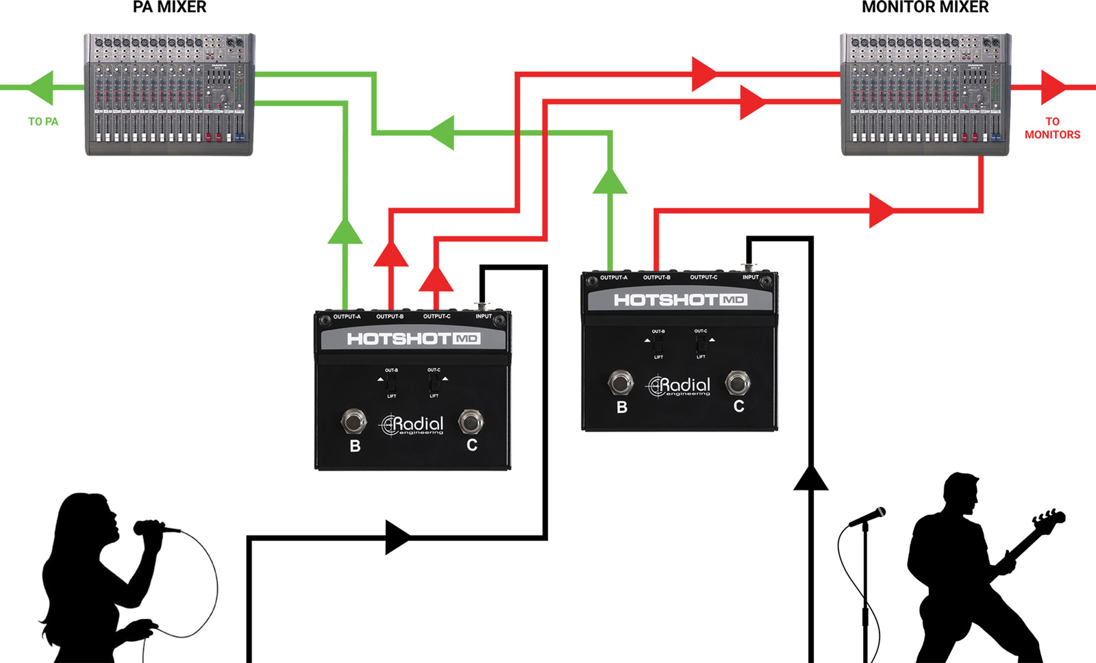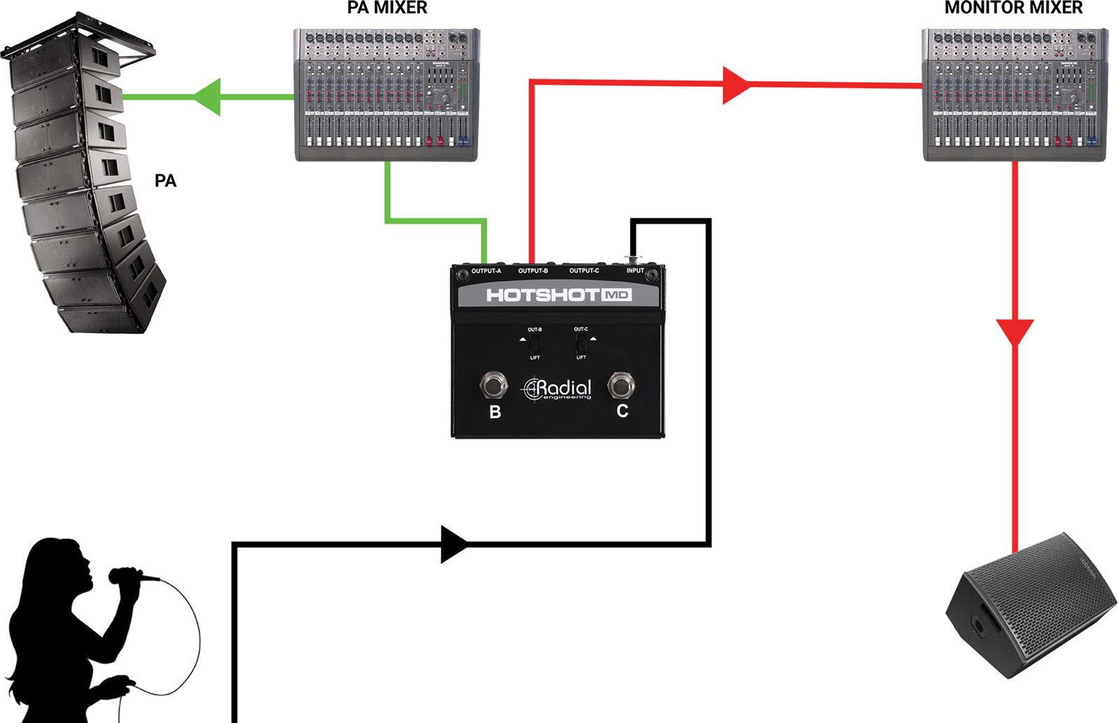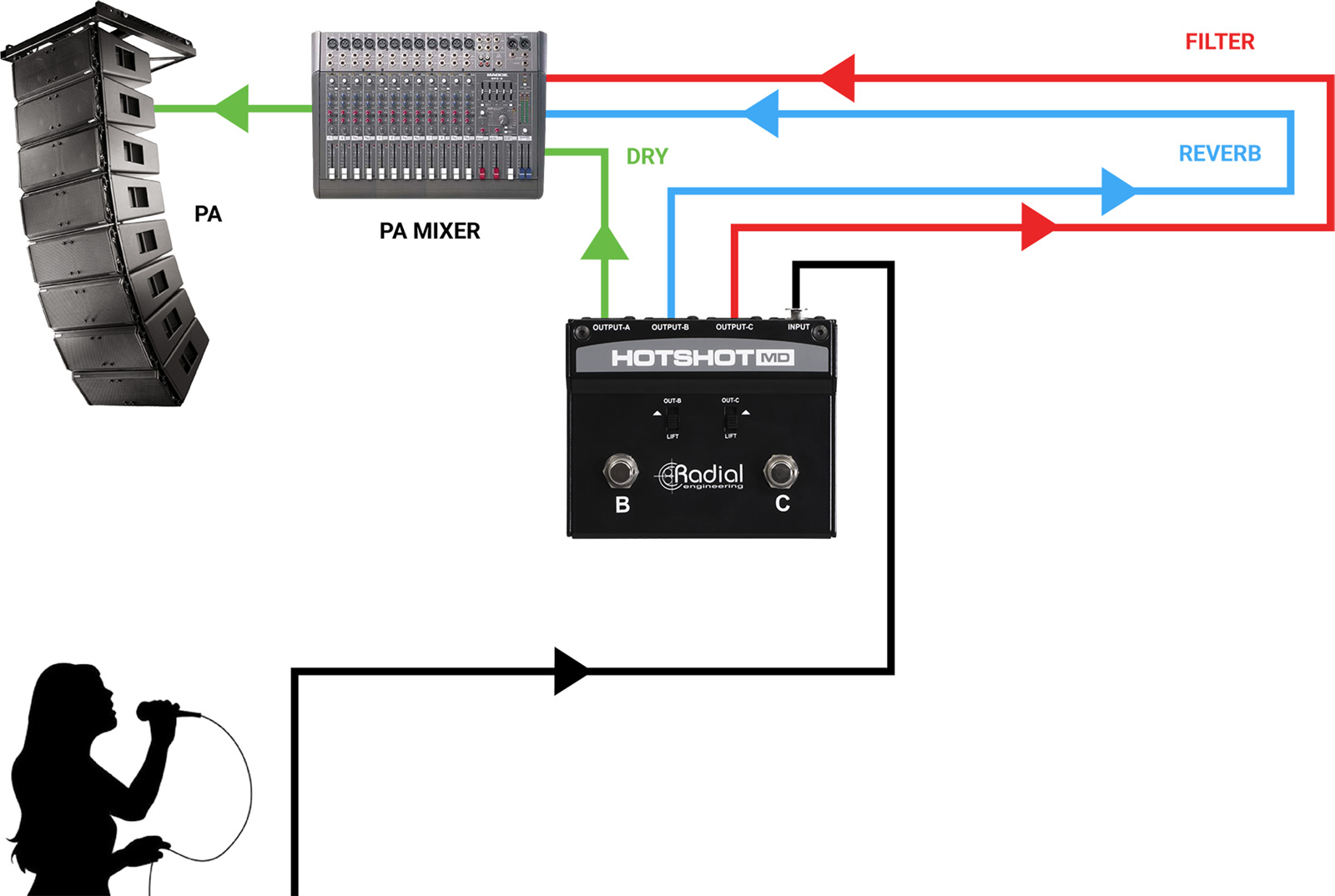 -Si l’un des footswitchs B ou C est activé, la sortie A vers la sonorisation est coupée et le signal est redirigé vers la sortie B et/ou la sortie C, selon le footswitch actionné. Cela vous permet de rediriger instantanément votre micro afin de parler avec les membres du groupe ou les techniciens, sans que le public n’entende quoi que ce soit.