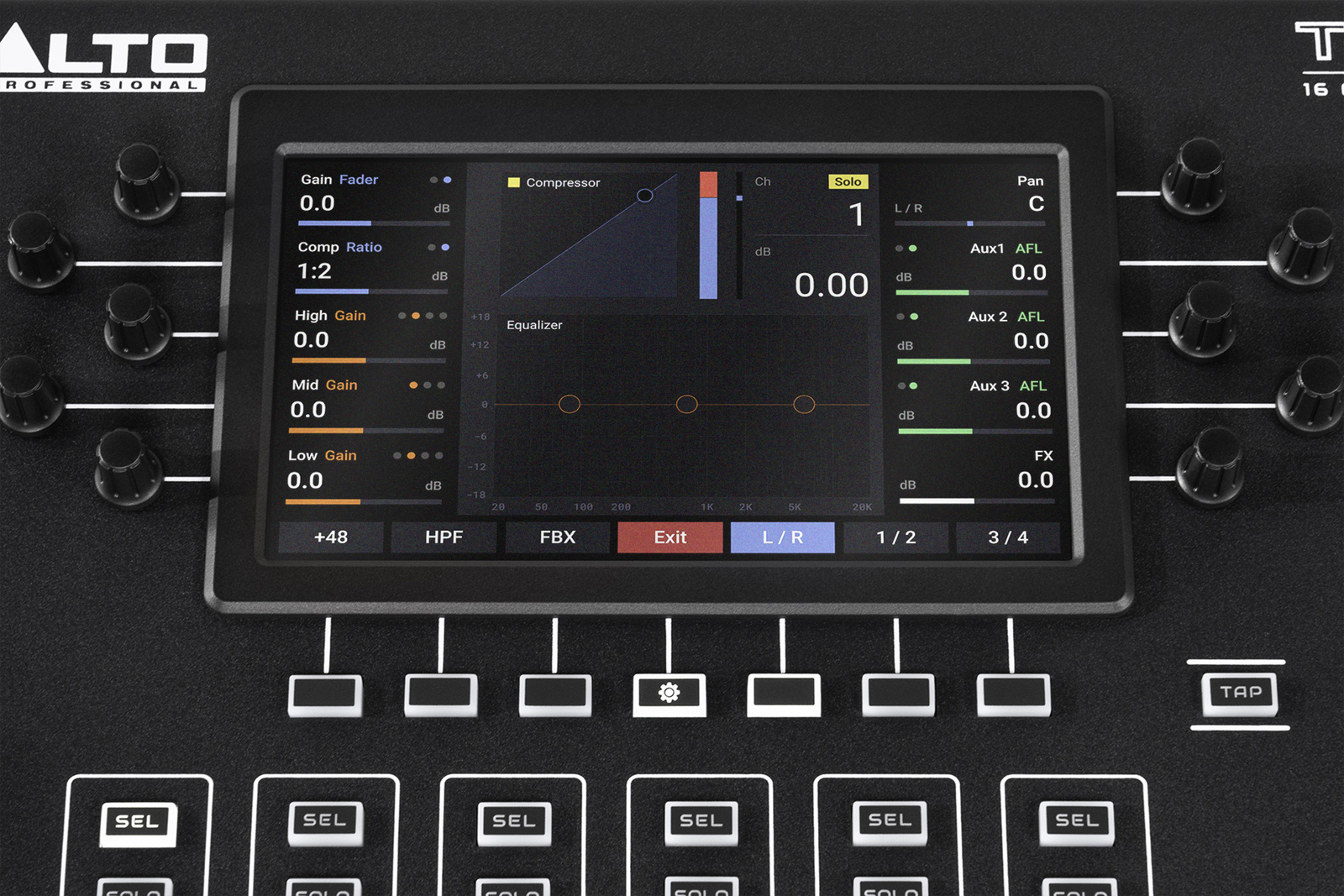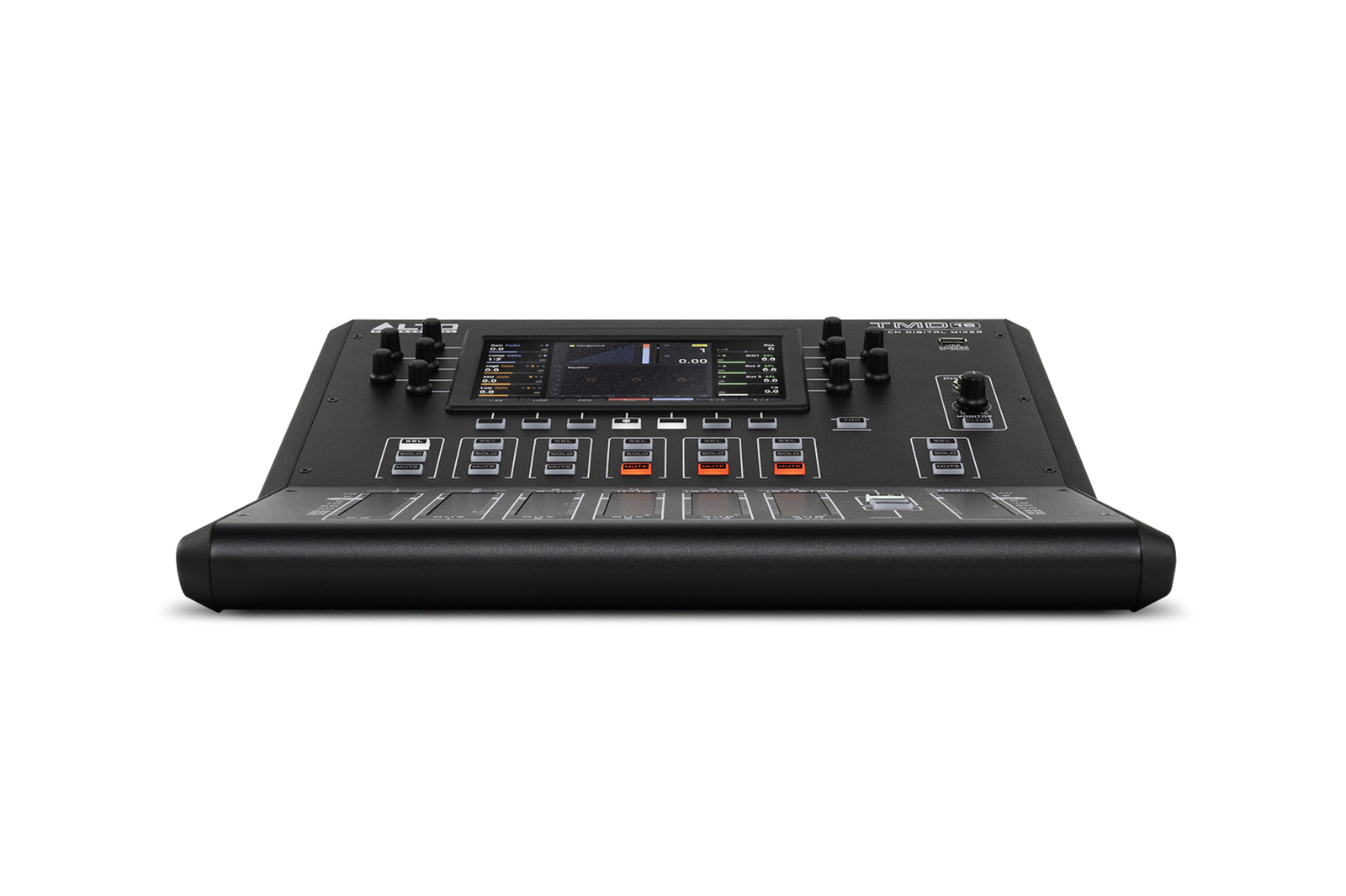 Les 100 mm faders capacitifs tactiles assurent un mixage précis offrant la sensation fluide et naturelle d’une console analogique tout en bénéficiant de la flexibilité du numérique. Chaque mouvement est accompagné d’un retour visuel immédiat au bord du fader et sur l’écran couleur 7 pouces, qui affiche niveaux, panoramiques, routages, effets et indicateurs de compression en temps réel.