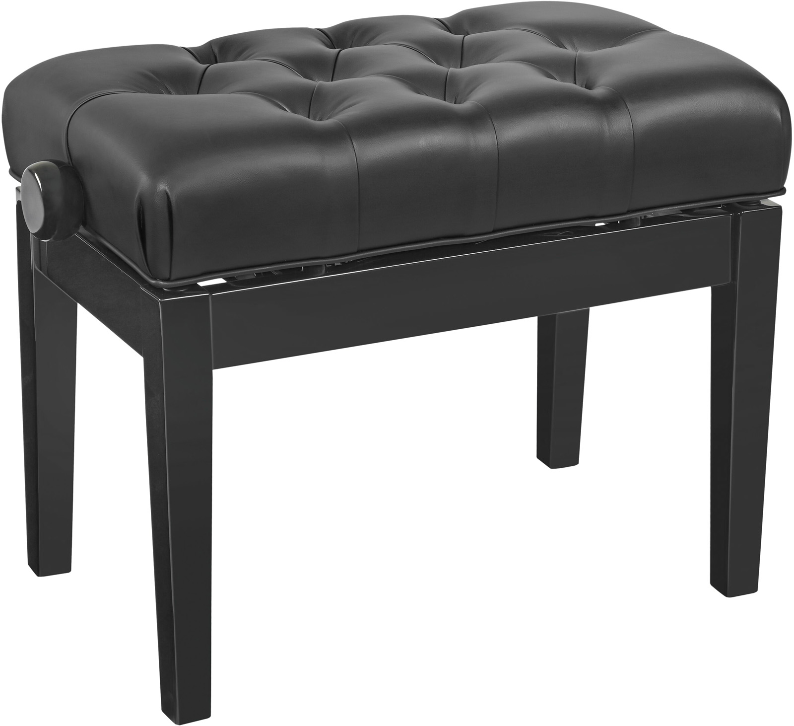 Ce banc de piano extrêmement confortable est équipé de vérins pneumatiques haute performance. La hauteur réglable en continu de 470 à 570 mm est également idéale pour les écoles de musique. La finition noir brillant et le revêtement en similicuir noir avec clous décoratifs lui confèrent un aspect élégant. Les pieds de nivellement garantissent une stabilité parfaite.