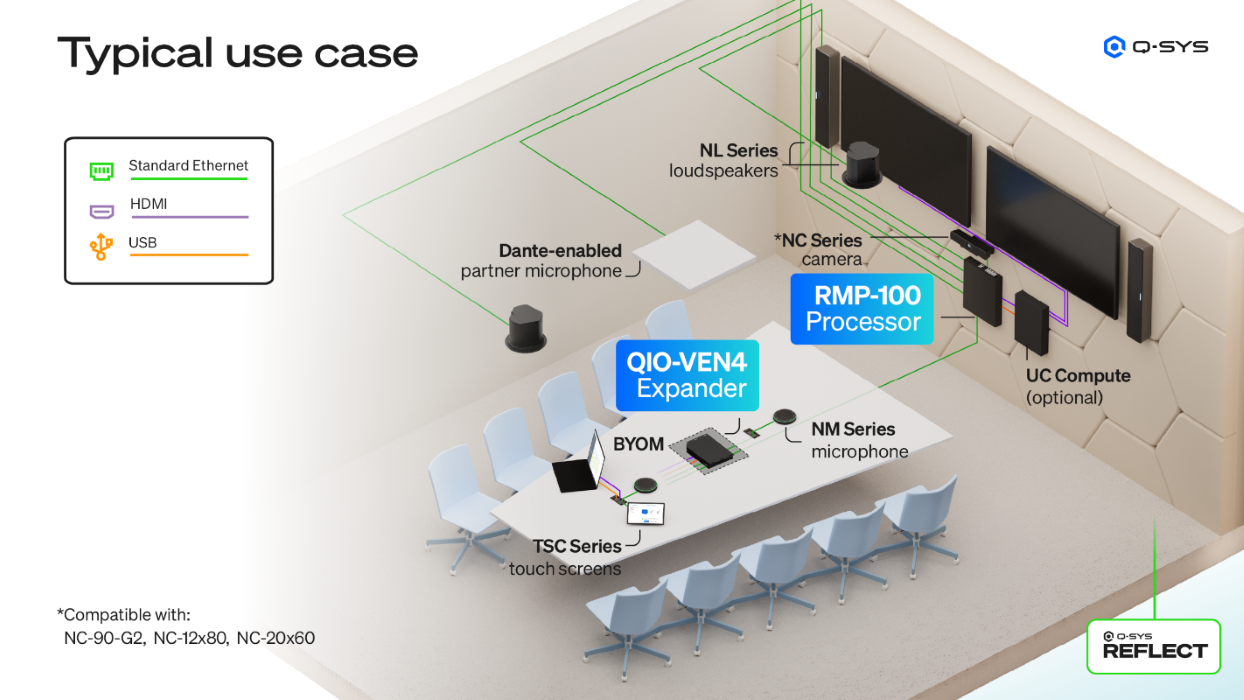 Conçu pour fonctionner avec les principales plateformes de communications unifiées et la fonctionnalité BYOM, il offre un interface Web pour une conception, une mise en service et un déploiement efficaces, le tout dans un cloud unifiée avec surveillance à distance via Q-SYS Reflect.