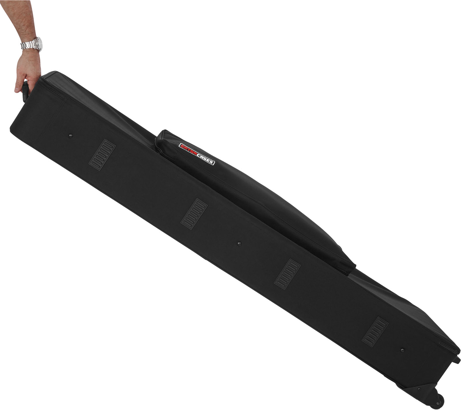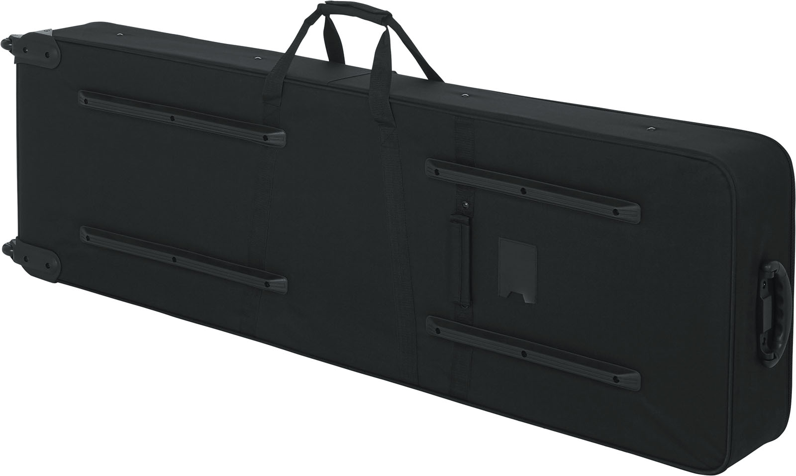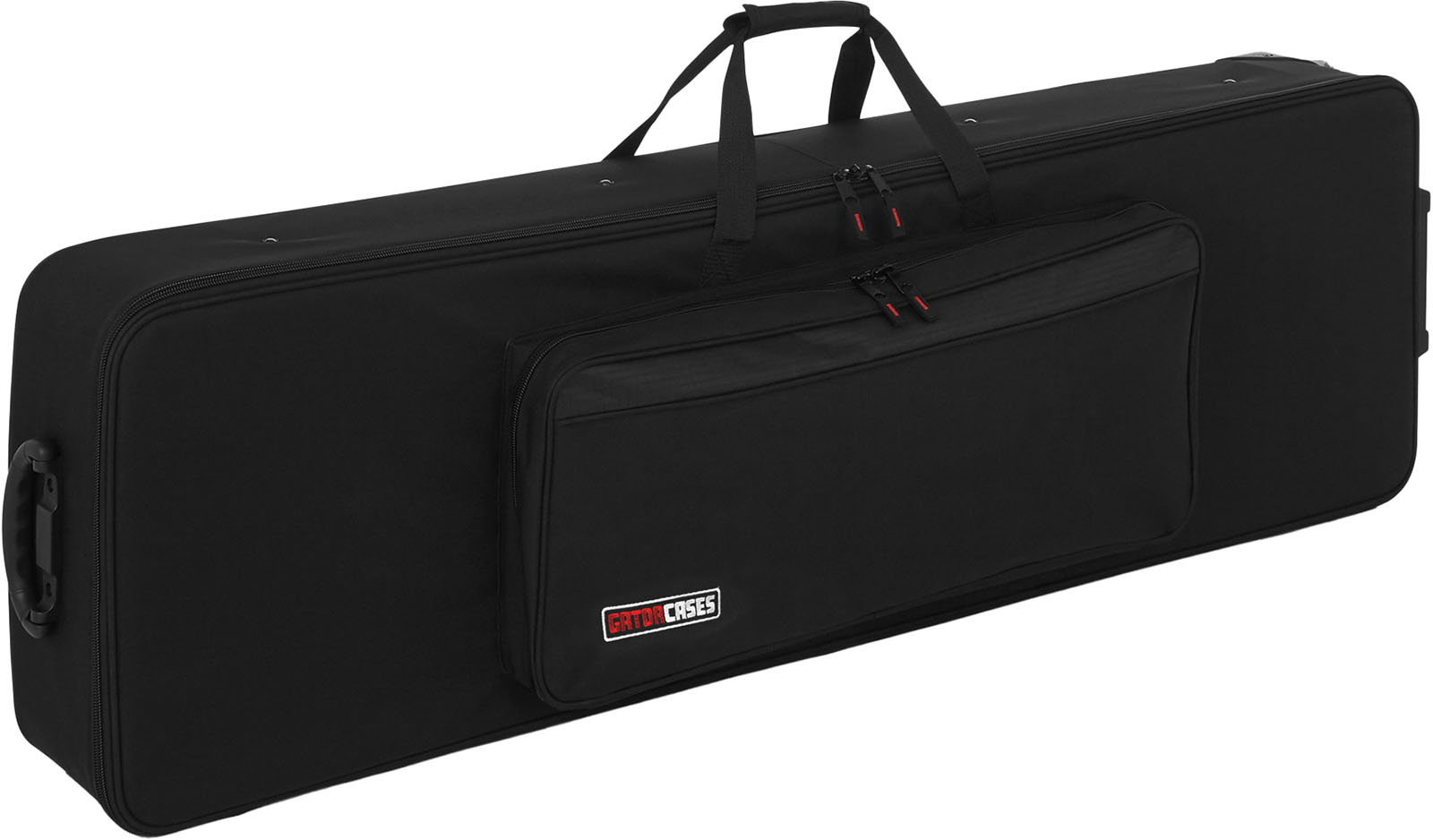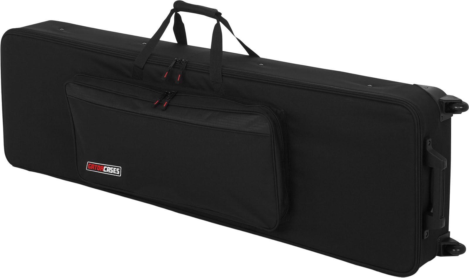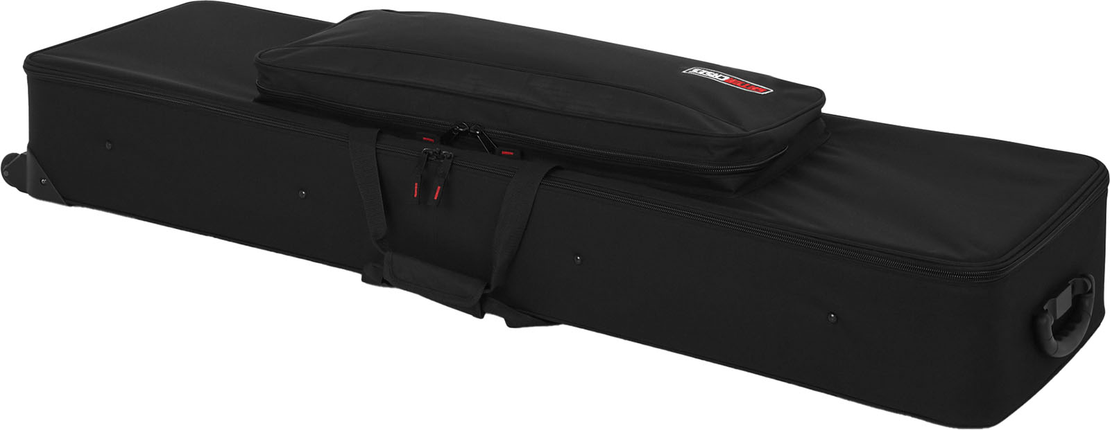 L'étui Gator GK dispose par ailleurs d'un large compartiment, avec fermeture à glissière, qui vous permettra de ranger tous vos accessoires, de la pédale de sustain aux partitions de musique. Les poignées en nylon facilitent le transport de votre instrument partout où vous allez mais...nul besoin de se casser le dos, cet étui est pourvu de roulettes !