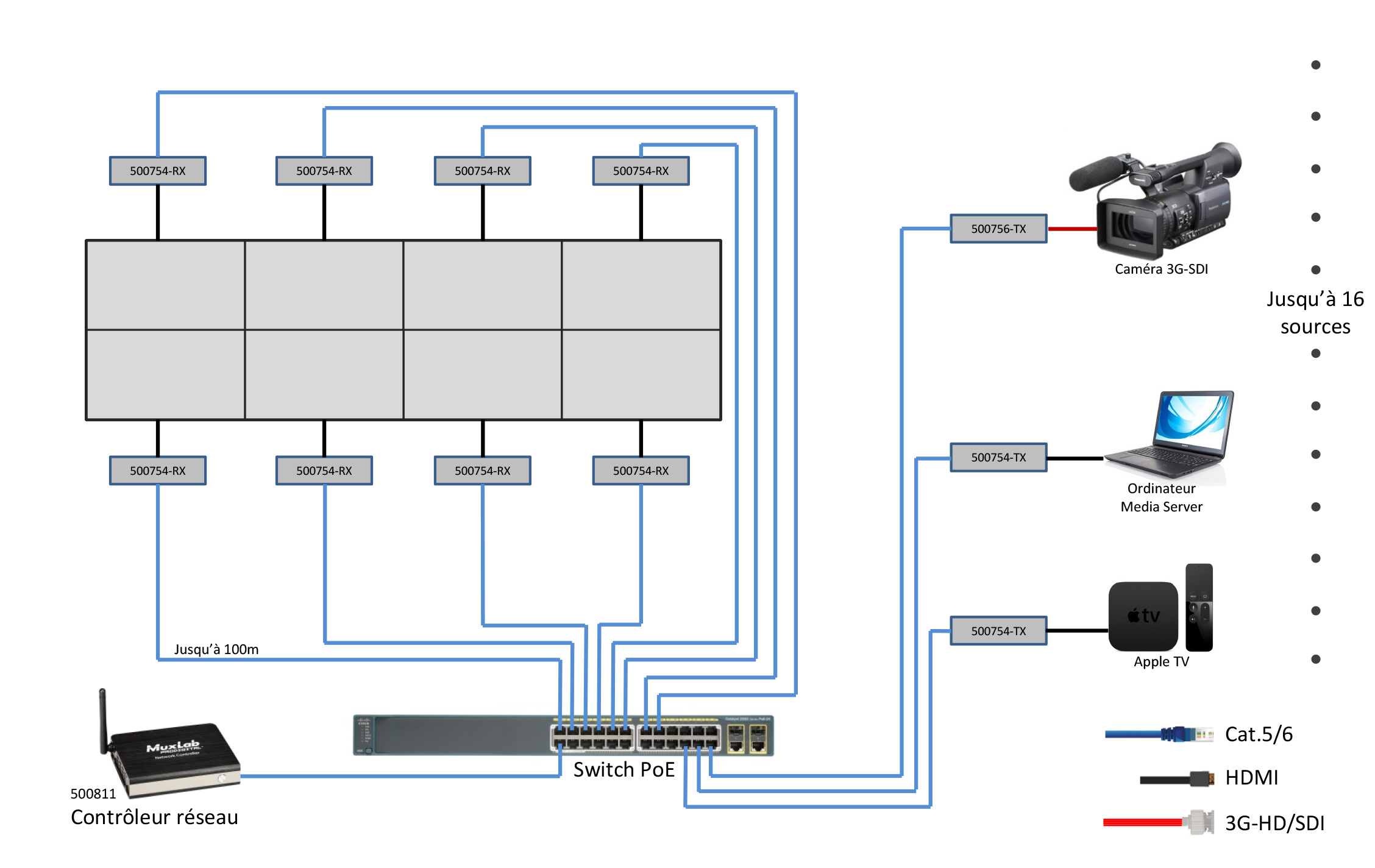 Les émetteurs sont connectés via le réseau à travers un switch (PoE ou non) avec un câblage Cat.5/6 jusqu'à 100m.