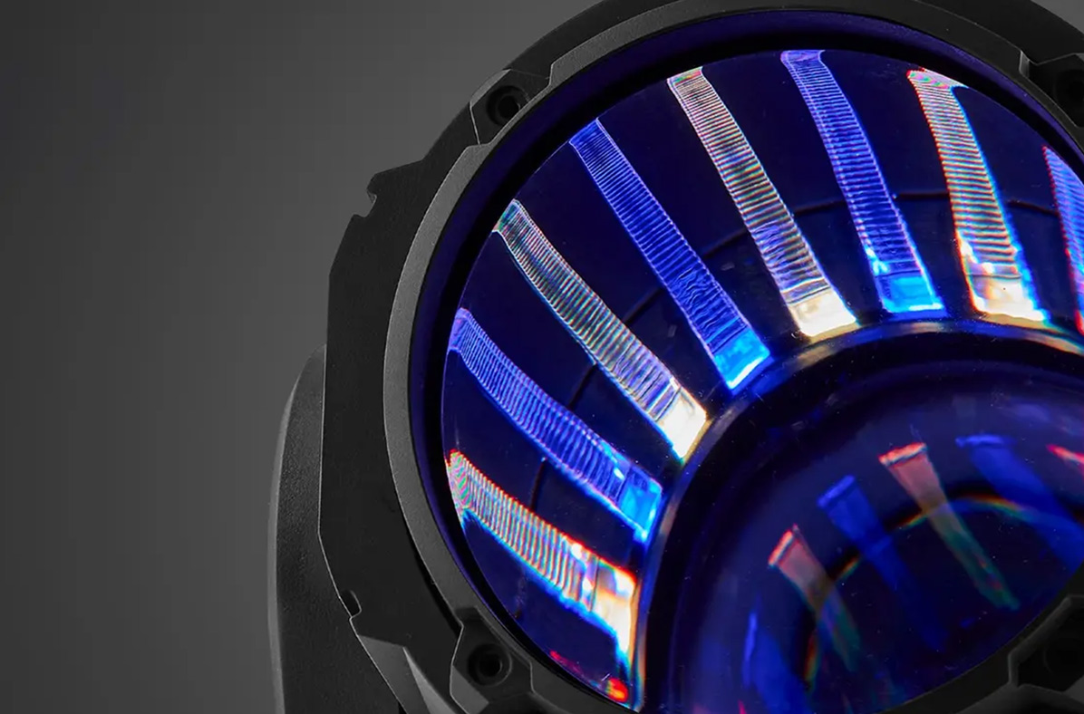 | Le mélange CMY rapide du projecteur permet des transitions fluides et des effets bicolores éclatants, offrant des rendus dynamiques avec une réactivité instantanée. | Derrière la lentille de 120 mm, 24 LEDs RGB génèrent un effet de rétroéclairage 3D avec contrôle pixel, ajoutant profondeur et présence même lorsque le faisceau est éteint. | |